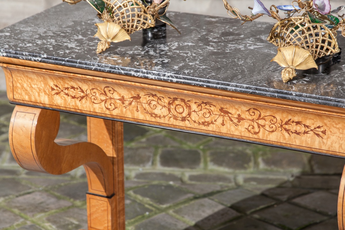 DESSERTE à ceinture en doucine renversée ouvrant à un tiroir en placage d'érable moucheté marqueté d'amarante de filets, rinceaux feuillagés et volatiles. Montants en console sur une base socle en accolade. Dessus de marbre gris Sainte Anne à double boudin.