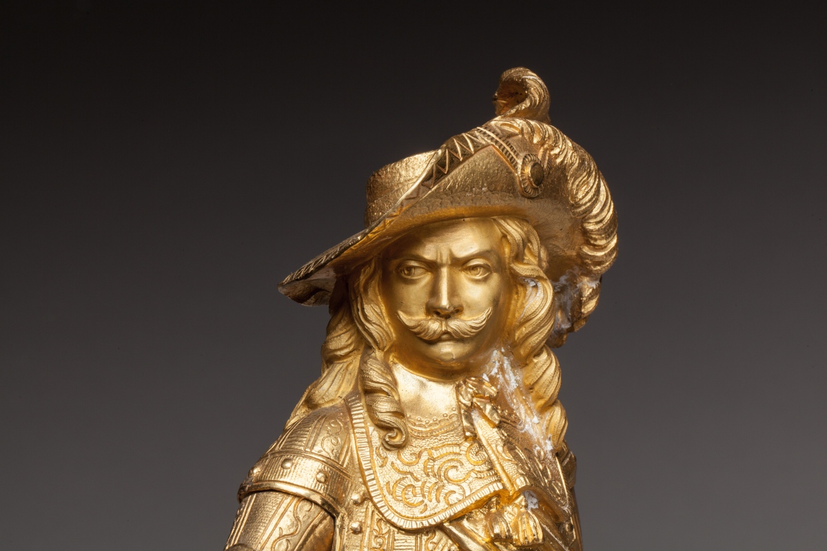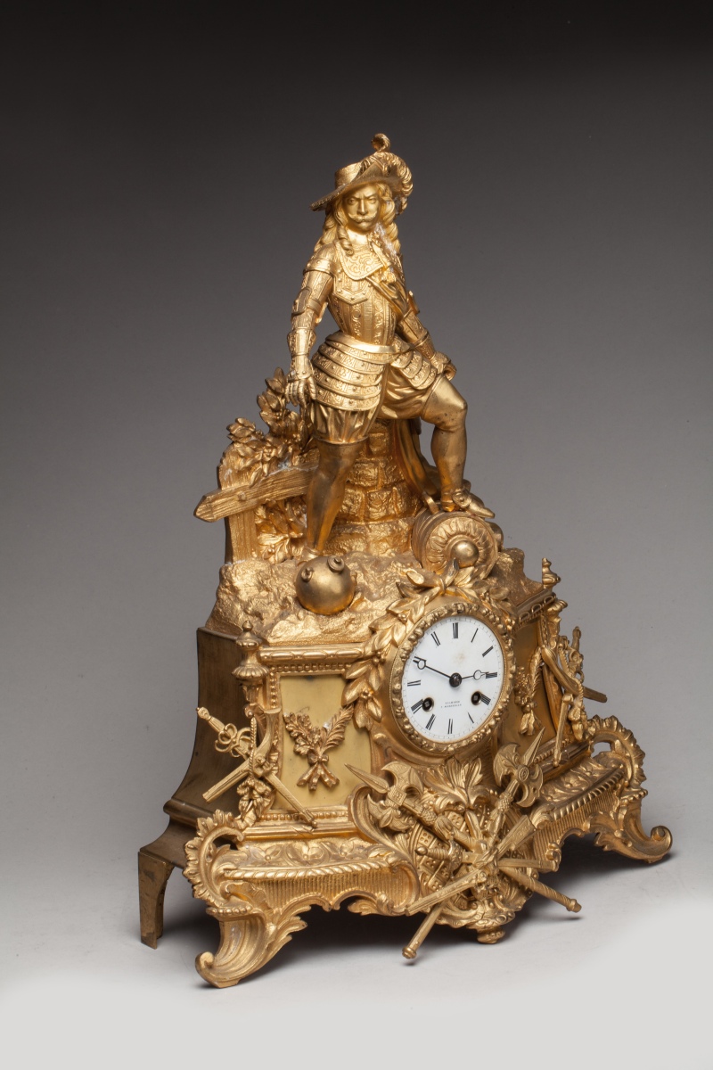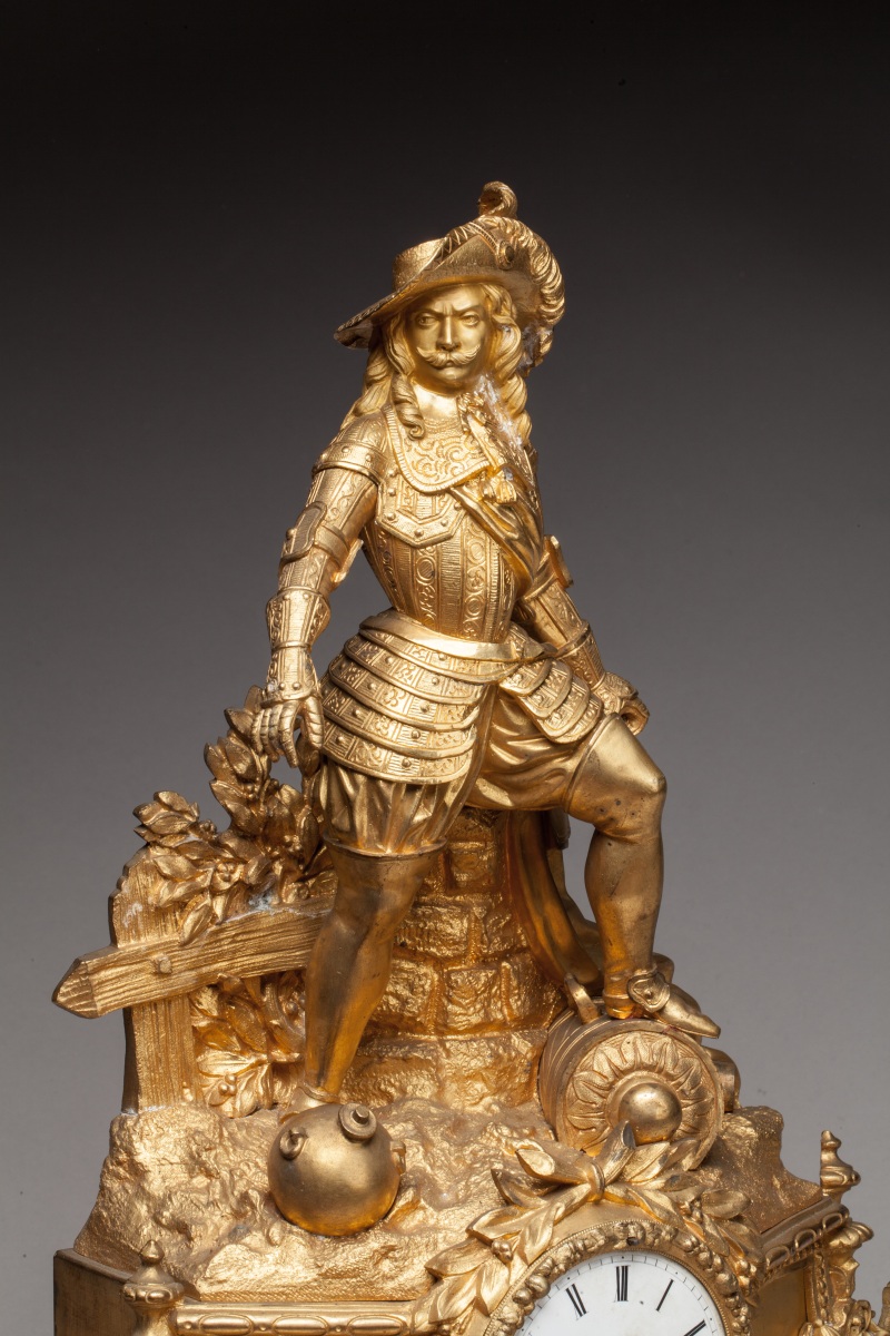 PENDULE À SUJET en régule et bronze doré figurant le maréchal de TURENNE. En armure, il se tient debout sur un tertre, le pied gauche posé sur un canon, le pied droit derrière une bombe. Derrière lui s'élèvent un muret et une barrière inscrite dans des feuillages.