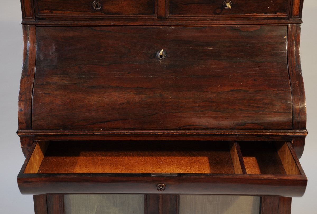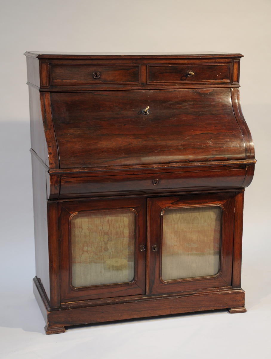 SCRIBAN À ABATTANT en palissandre et placage de palissandre. Deux petits tiroirs fermant à clé sous la corniche et un large en ceinture, l'intérieur plaqué de loupe d'érable. L'abattant incurvé. En partie inférieure, deux portes vitrées doublées d'un tissu de moire verte ouvrent sur deux étagères. Piètement en plinthe.