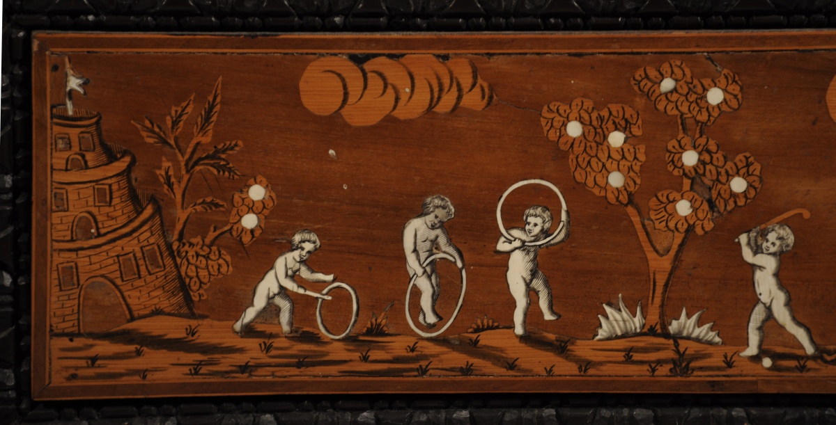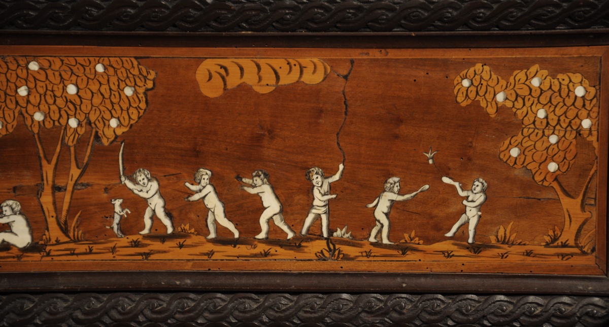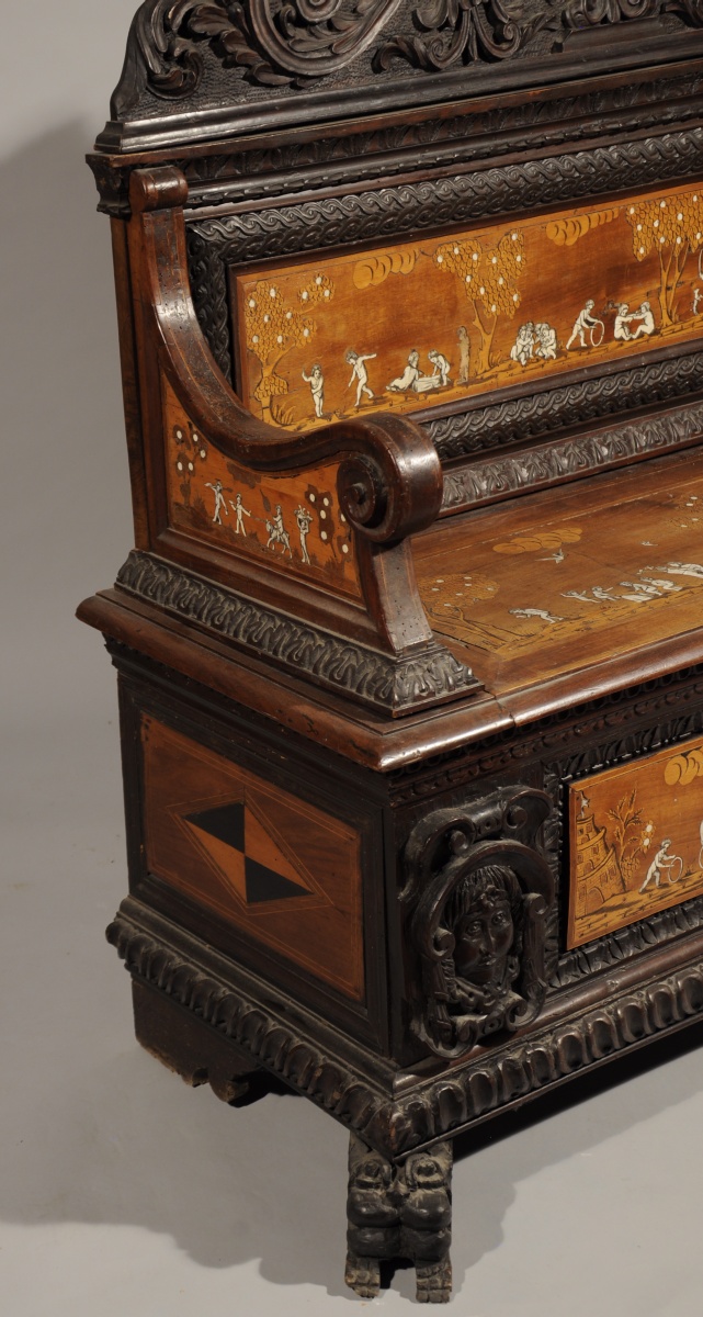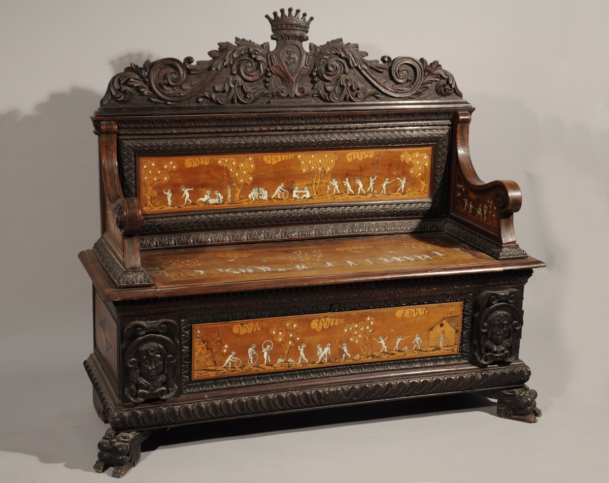 BANC-COFFRE en noyer, bois teinté et bois clair à décor en incrustation d'ivoire de putti s'amusant sur fond paysagé. Le dossier coiffé d'un élément chantourné sculpté d'un écu casqué timbré d'une couronne dans un encadrement de rinceaux. Repose sur quatre pieds, les pieds antérieurs figurant un lion.
