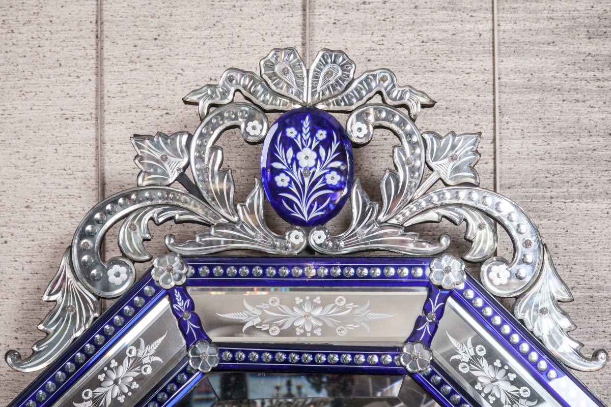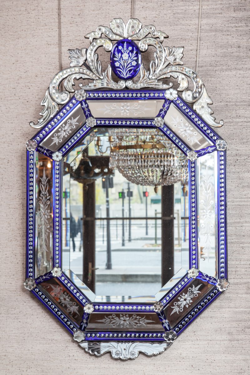 MIROIR "de VENISE" octogonal biseauté à fronton ajouré dans un encadrement à pare-closes à profil renversé de baguettes taillées à fond bleu nuit et décor gravé de motifs floraux.