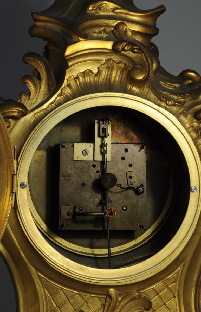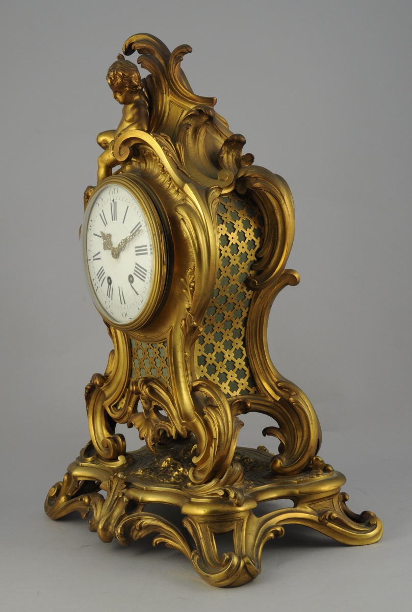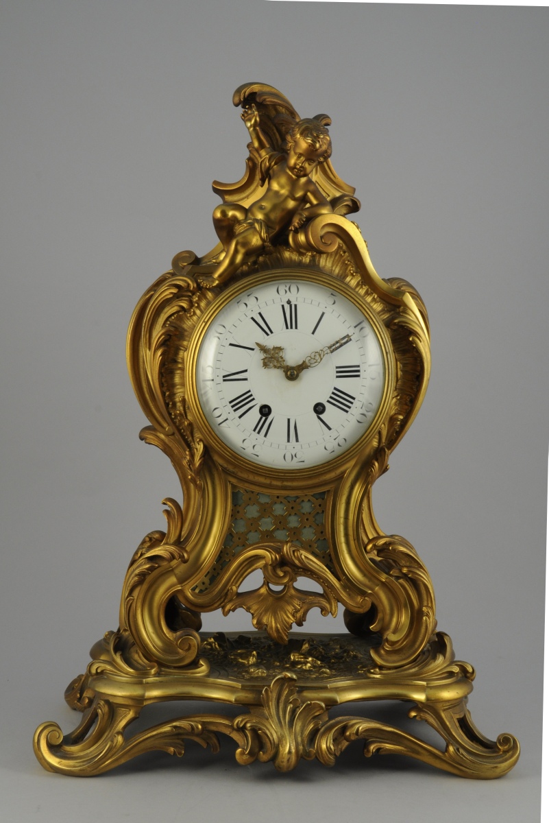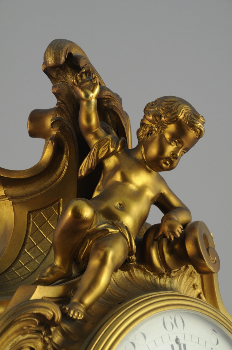 PENDULE À L'AMOUR en bronze ciselé et doré. Elle reçoit une riche ornementation ajourée de feuilles d'acanthe stylisées, enroulements, croisillons et est agrémentée d'un putto à l'amortissement. Repose sur un socle adhérent quadripode. Le cadran émaillé blanc indique les heures en chiffres romains et les minutes en chiffres arabes. Le mouvement marqué " France " est numéroté 5463.