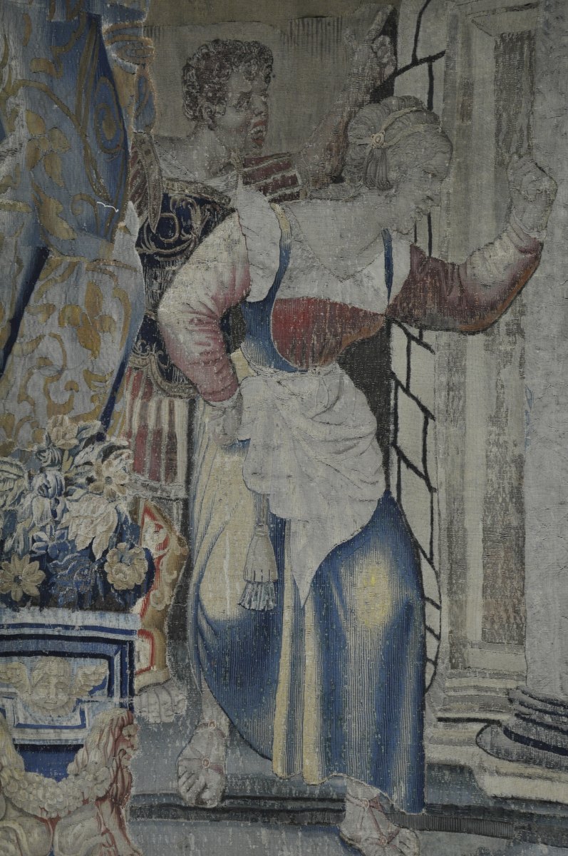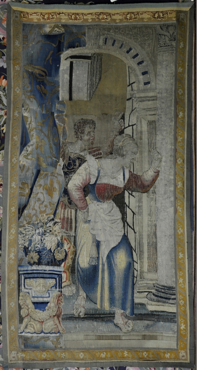 AUBUSSON. TAPISSERIE en laine. Scène de palais animée d'un homme vêtu à l'Antique accompagné d'une femme. Fragment.