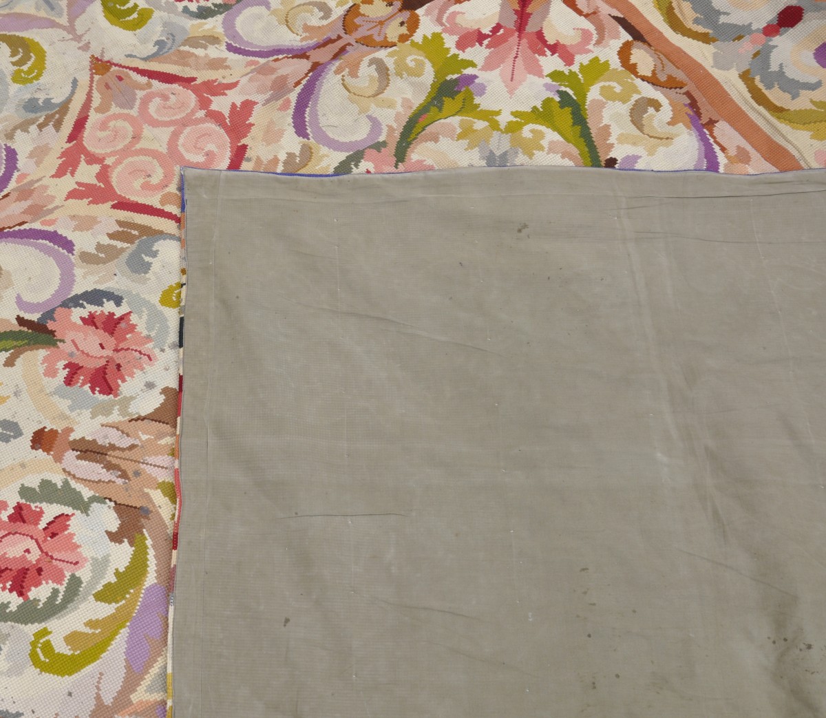 FRANCE ou ANGLETERRE (?) TAPIS à demi-point noué canevas, à dominante bleu rose vert sur fond crème, à décor floral et d'acanthes. Larges bordures sur trois côtés.