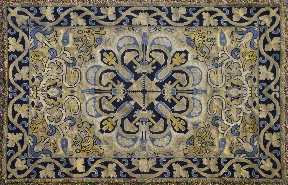 ARRAIOLOS. TAPIS au point en laine à décor de feuillages stylisés et oiseaux sur fond vert. Une large rosace au centre. Bordure à fond bleu.