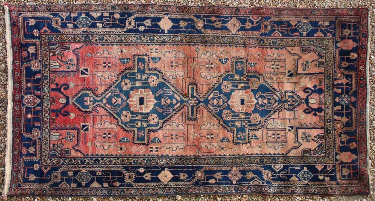 KAZAK? TAPIS en laine à décor géométrique de deux médaillons sur fond rose. Bordure florale à fond bleu entre deux contre-bordures, l'une à fond crème, l'autre à fond rose.