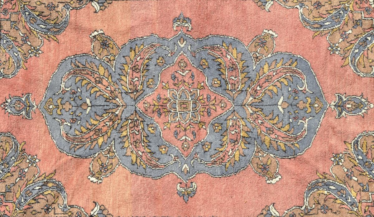 TAPIS d'Orient en laine à points noués, à décor persan, médaillon central bleu sur fond rose.