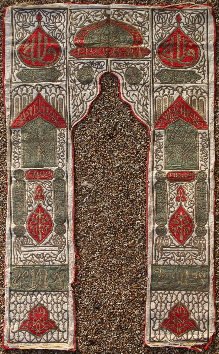 PORTIÈRE ou NICHE DE PRIERE, dite MIHRAB brodée de fil d'or sur des tissus de soie verte et rouge.
