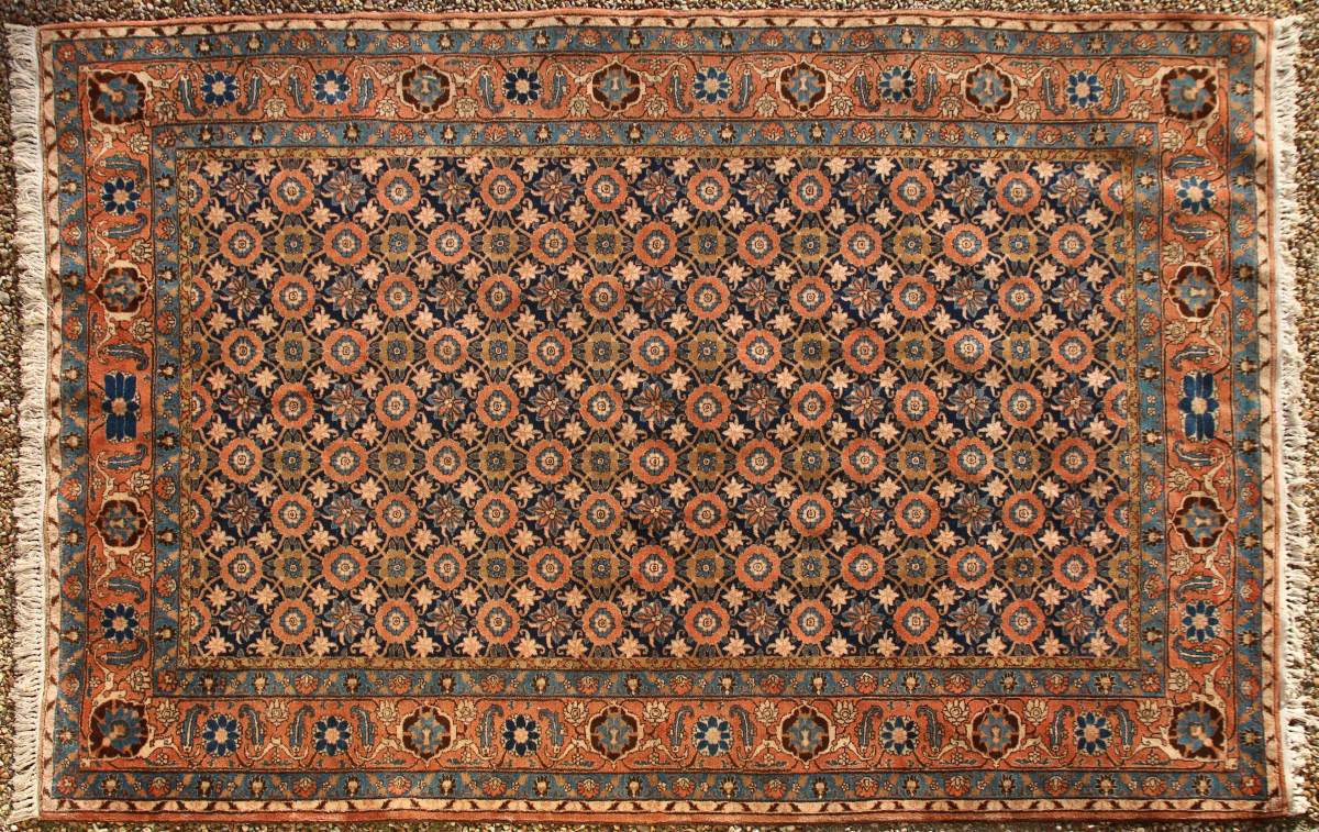 PERSE. TAPIS VERAMIN en laine à décor dit "Mina-Hani" d'un treilli de fleurs de pivoine, narcisse et lys sur fond bleu. Bordure florale à fond rouge-orangé flanquée de part et d'autre de deux contre-bordures.