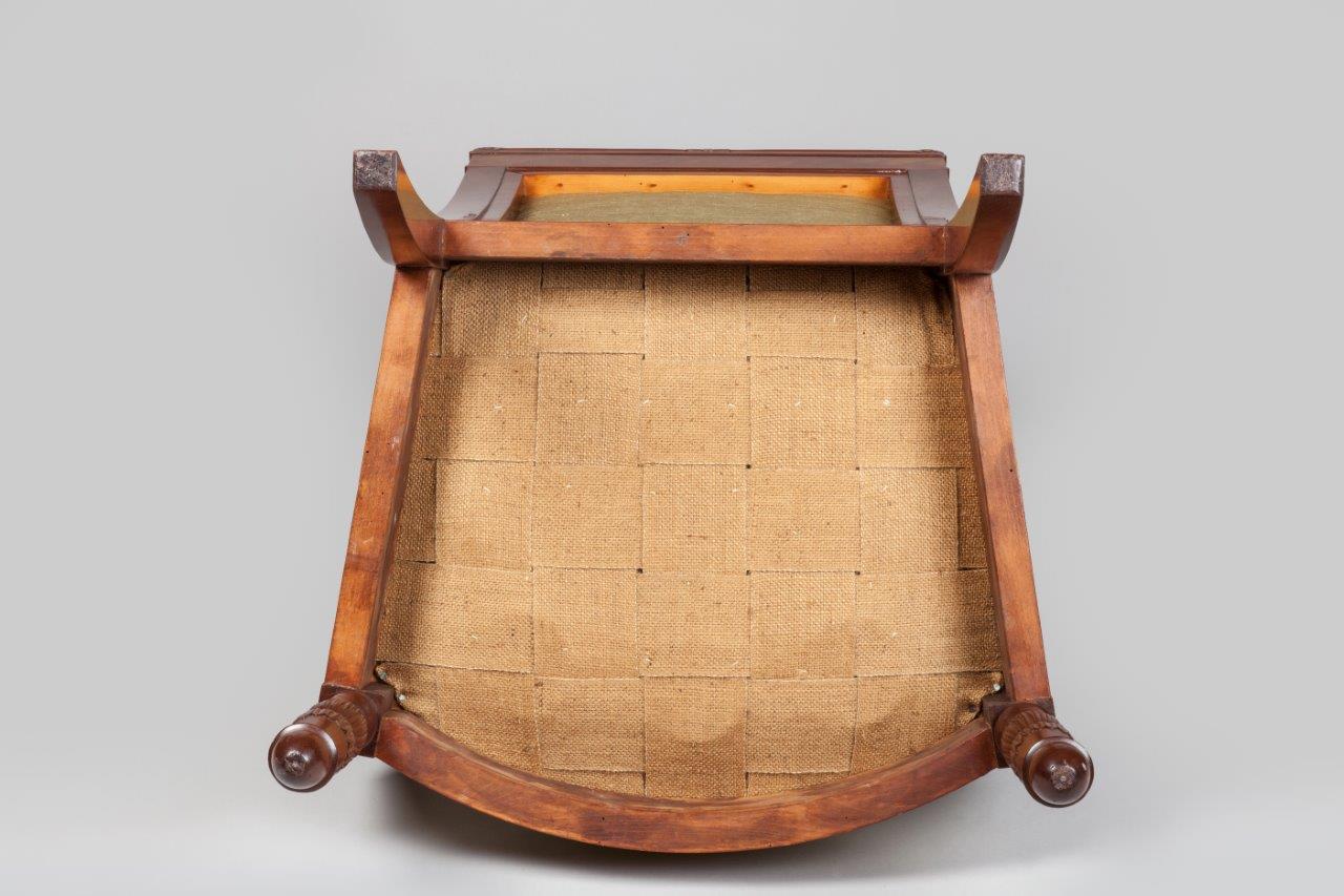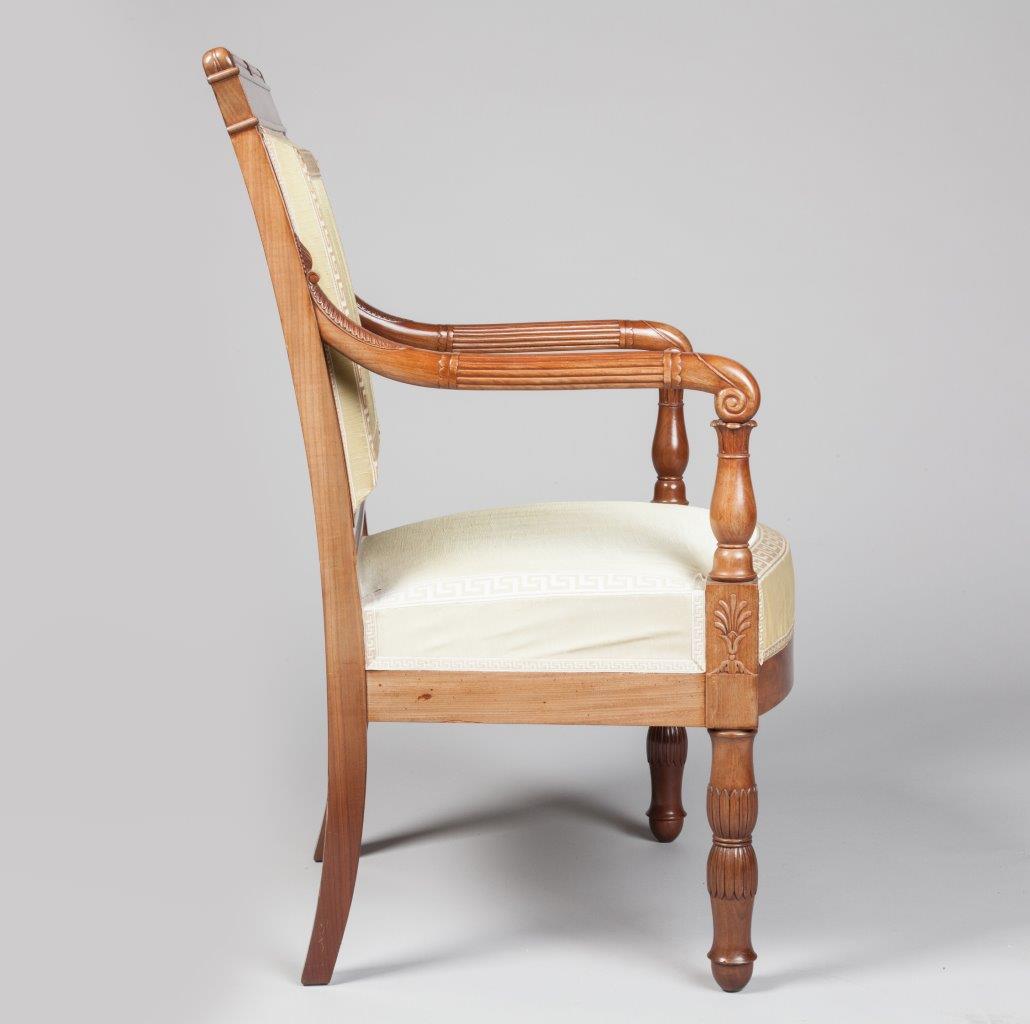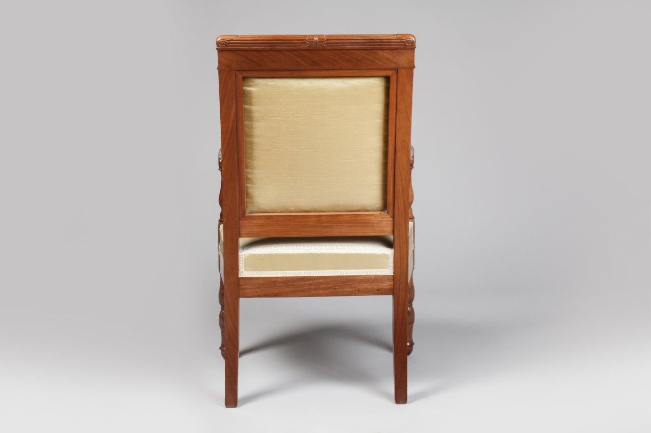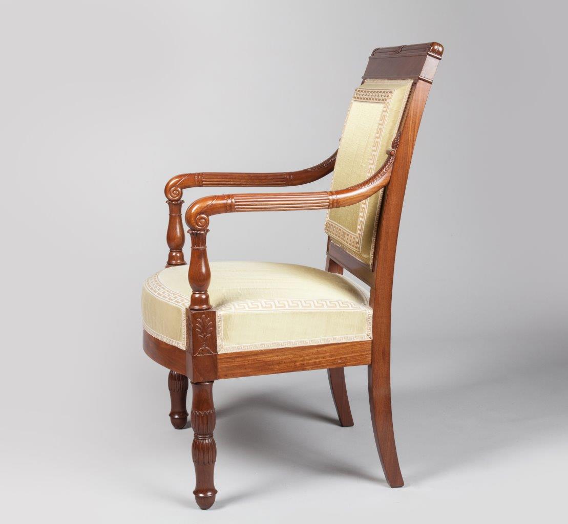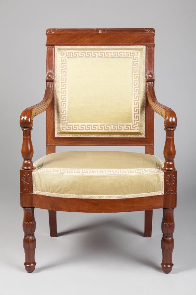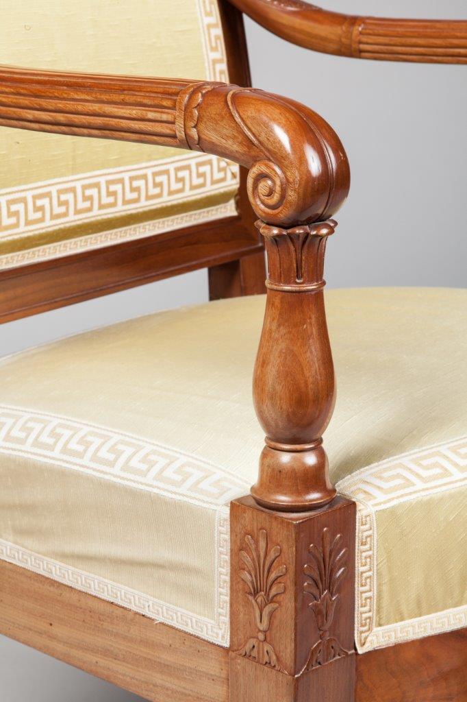 Paire de FAUTEUILS en acajou. Dossier rectangulaire à la reine légèrement renversé, terminé par des enroulements et moulures baguettes à feuilles d'eau. Accotoirs moulurés et sculptés de palmettes, supports d'accotoir en balustre à feuilles de lotus, dés de raccordement à palmettes stylisées. Piètement postérieur en gaine et antérieur à renflements sculpté de feuilles d'eau.