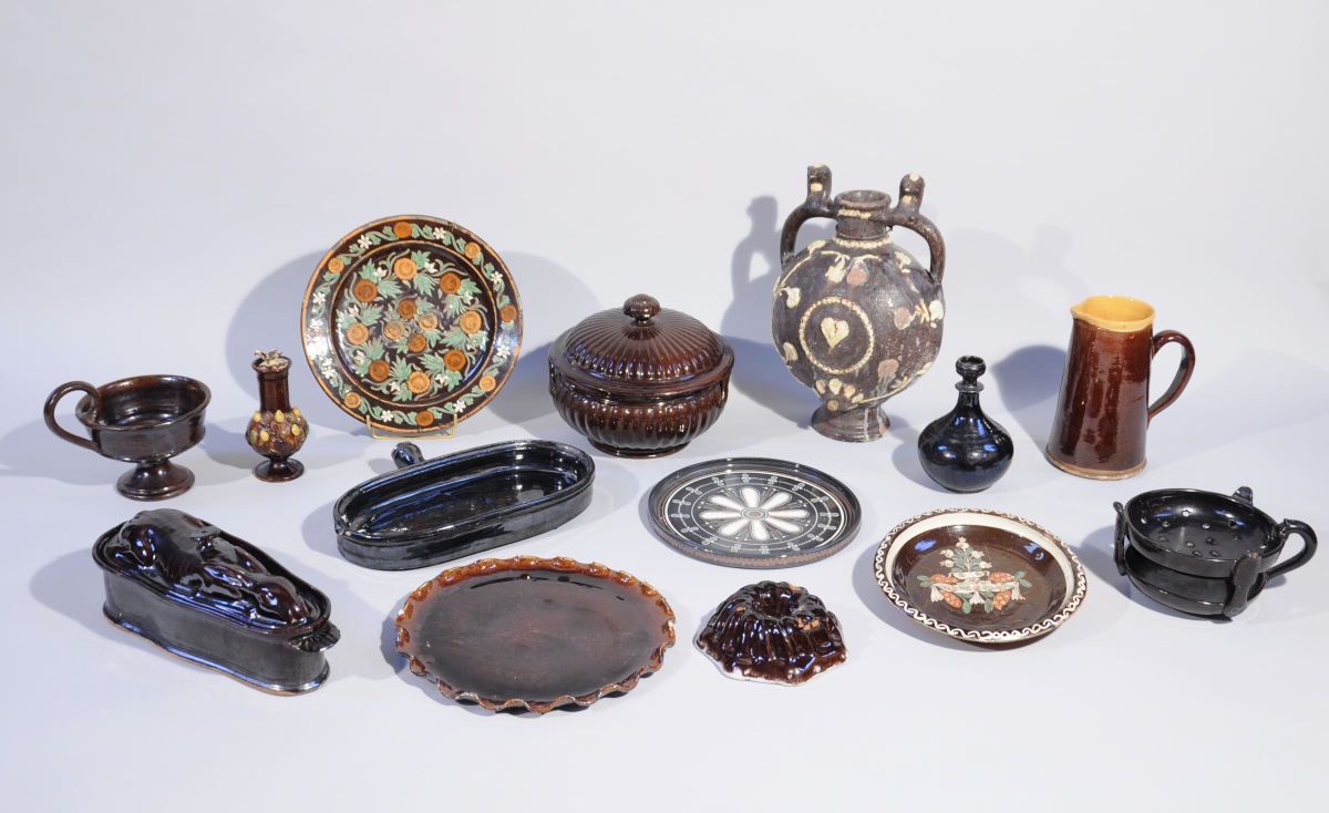 Ensemble de TERRES-CUITES VERNISSÉES BRUNES comprenant 14 pièces, dont: moule à gâteau, deux bouteilles, un lèchefrite (larg. 42 cm), un broc, un vinaigrier (haut. 43,5 cm), un pot à oil, un plateau, une terrine (long. 44 cm), deux plats, un égouttoir et une coupe.