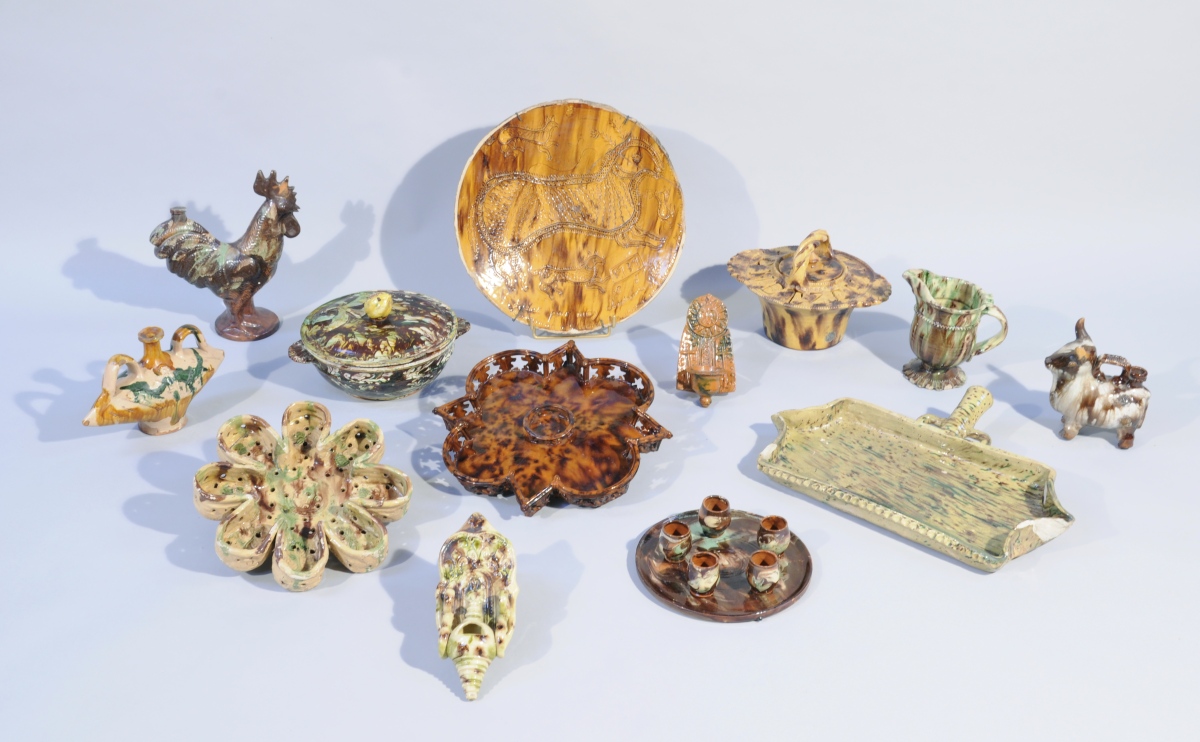 Ensemble de TERRES-CUITES VERNISSÉES MARBRÉES OCRE ET VERT comprenant 18 pièces, dont: plat mendiant polylobé (diam. 33,5 cm), un grand plat de monstrance daté 1737 et signé Antoine Gillet (diam. 38 cm), un pot-à-oille avec prises en grenade (diam. 23,5 cm), un chapeau à anse, cinq gobelets à liqueur et leur plateau, un égoutoir polylobé, deux bénitiers, une aiguière casque (haut. 18 cm), deux aquamanilles zoomorphes (un taureau et un coq) , une gourde de forme navette et un lèche frites (long. 48 cm).