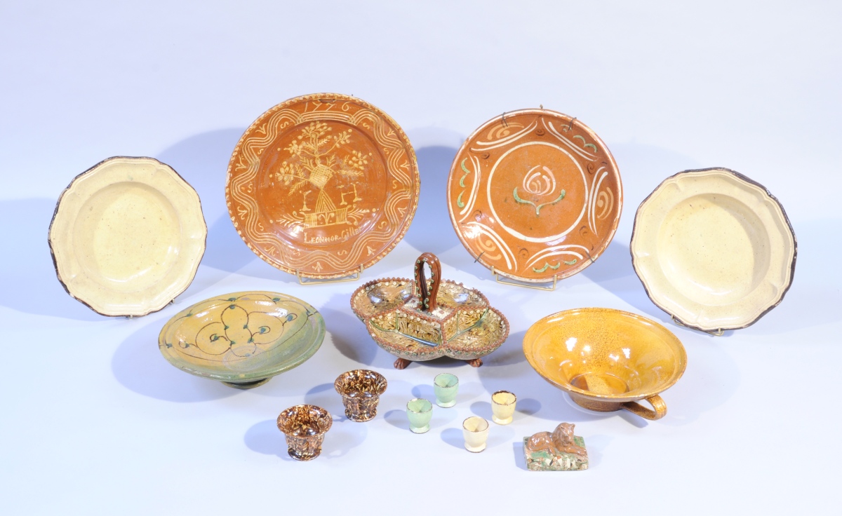 Ensemble de TERRES-CUITES VERNISSÉES JAUNES comprenant 14 pièces, dont: un plat mendiant à pieds griffes avec quatre réceptacles dans le genre d'Apt (haut. 20,5 cm), deux tasses sur talon et un lion sur son socle dans le genre d'Apt, un plat de monstrance daté 1776 et signé Léonnor Gillet (diam. 40 cm), deux coupes évasée dont une à anses et l'autre sur talon, un grand plat creux, deux grandes assiettes creuses et quatre coquetiers.