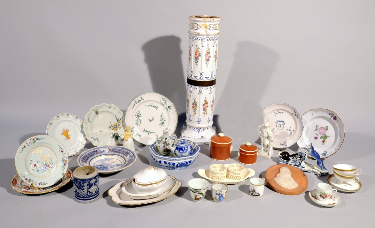 FRANCE, CHINE et divers. Ensemble comprenant une trentaine de pièces en céramique, dont: une colonne à décor floral polychrome (haut. 70,5 cm), un médaillon en Saint-Clément figurant le Christ de profil en buste (diam. 19,5 cm), un plateau oblong blanc et or en Saint-Clément (long. 31,56 cm, une saucière couverte et son dormant en Saint-Clément, 8 assiettes dont une en Saint-Clément, une à semi de barbeaux, deux dans le goût ou de la Compagnie des Indes, un porte pipe au renard poussant un traineau (long. 26 cm), deux gobelets et deux théières dont une égoïste en porcelaine de la Chine, un sujet en biscuit, une tasse et sa sous-tasse, deux pots-couverts en Sarreguemines, un huilier vinaigrier en faïence fine, une paire de tasses et leurs sous-tasses en porcelaine à décor à l'or, une tasse en porcelaine blanc et or, un pot en grès vernissé.