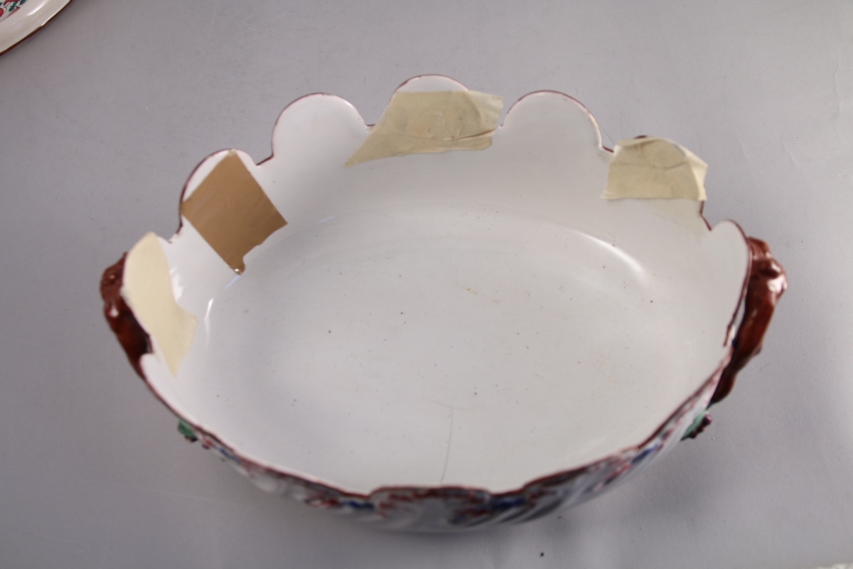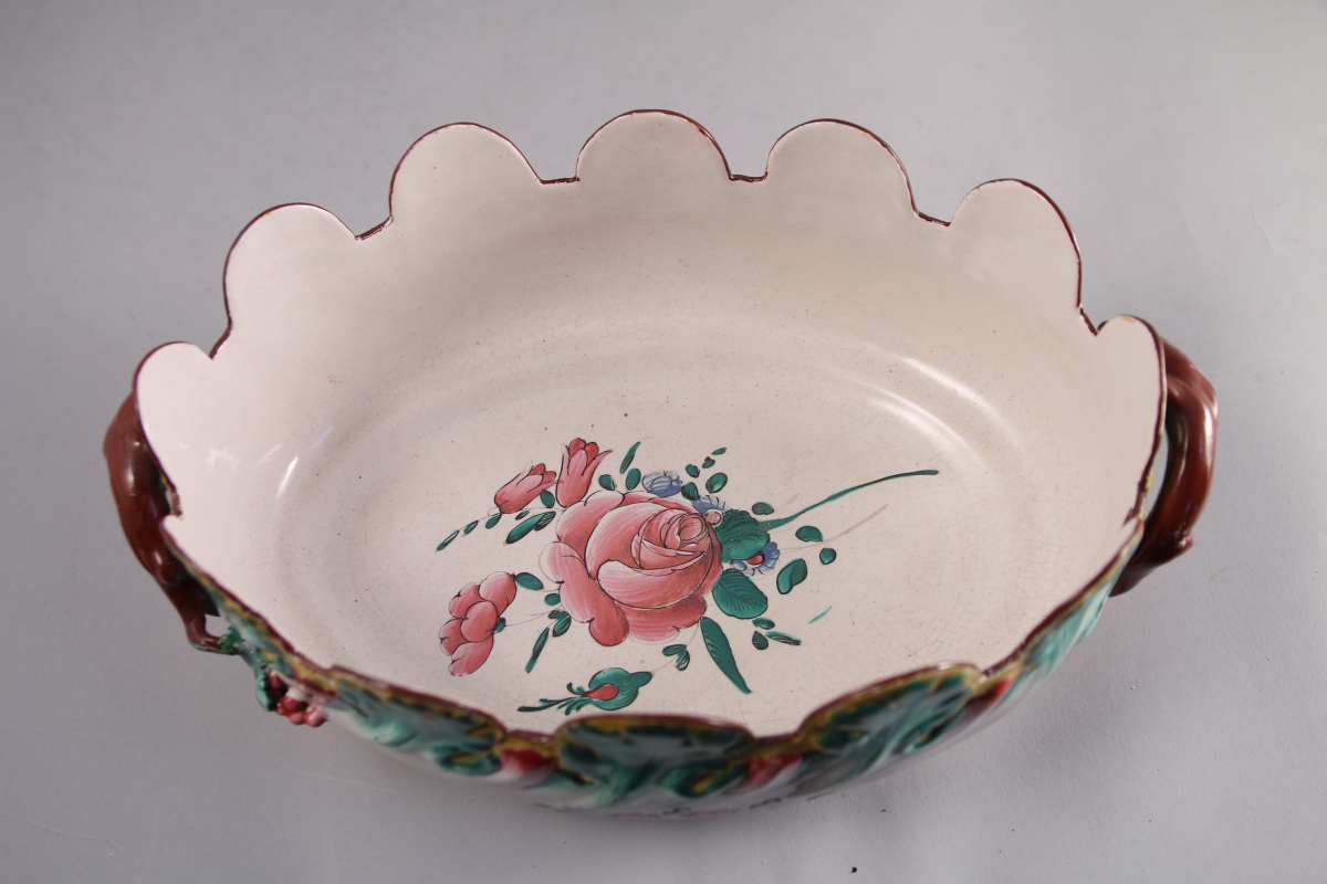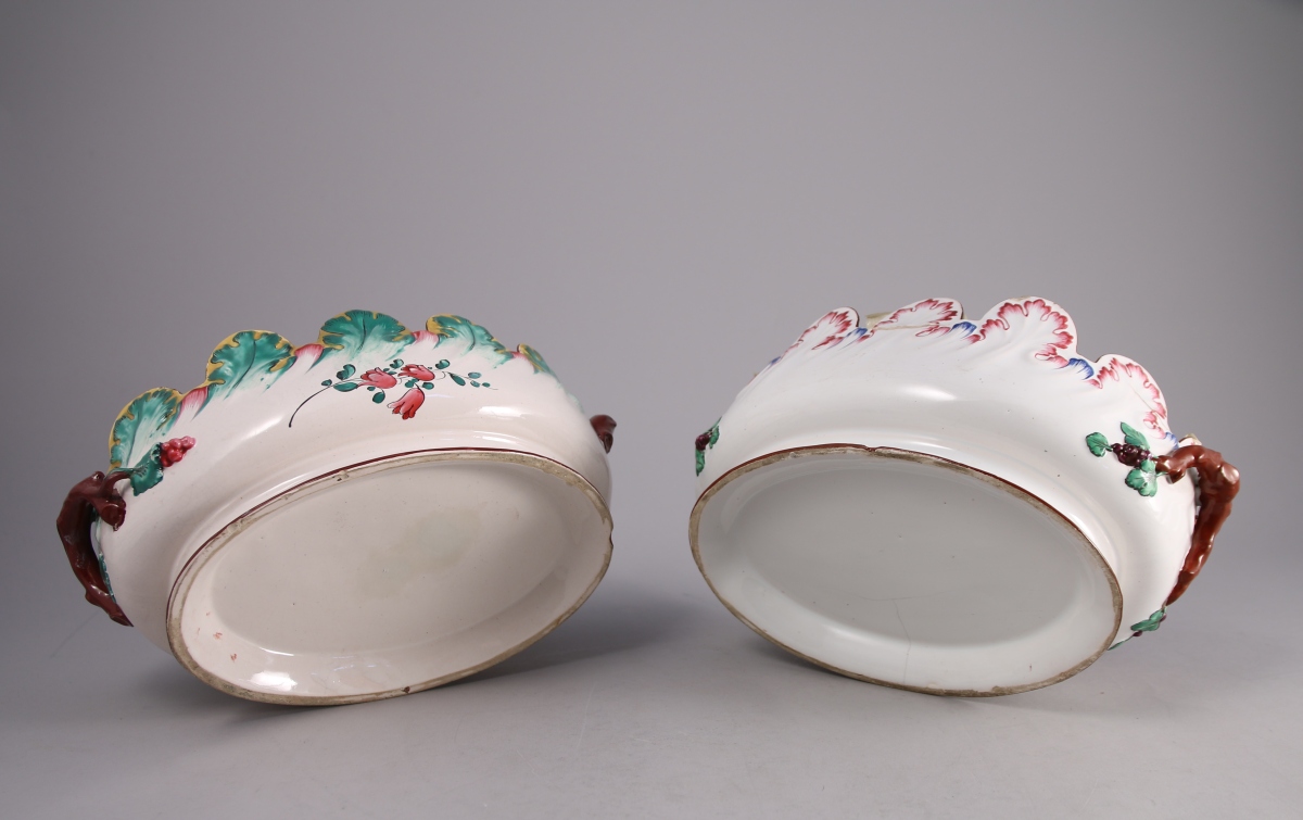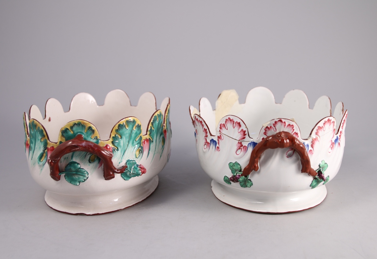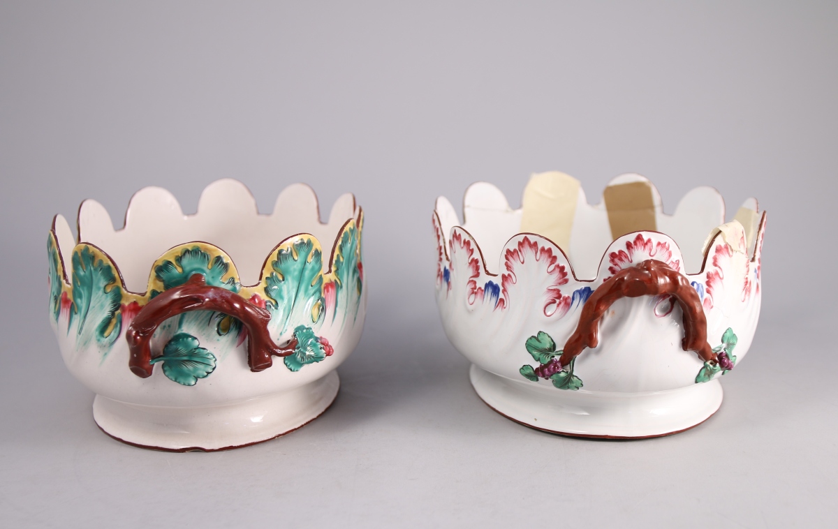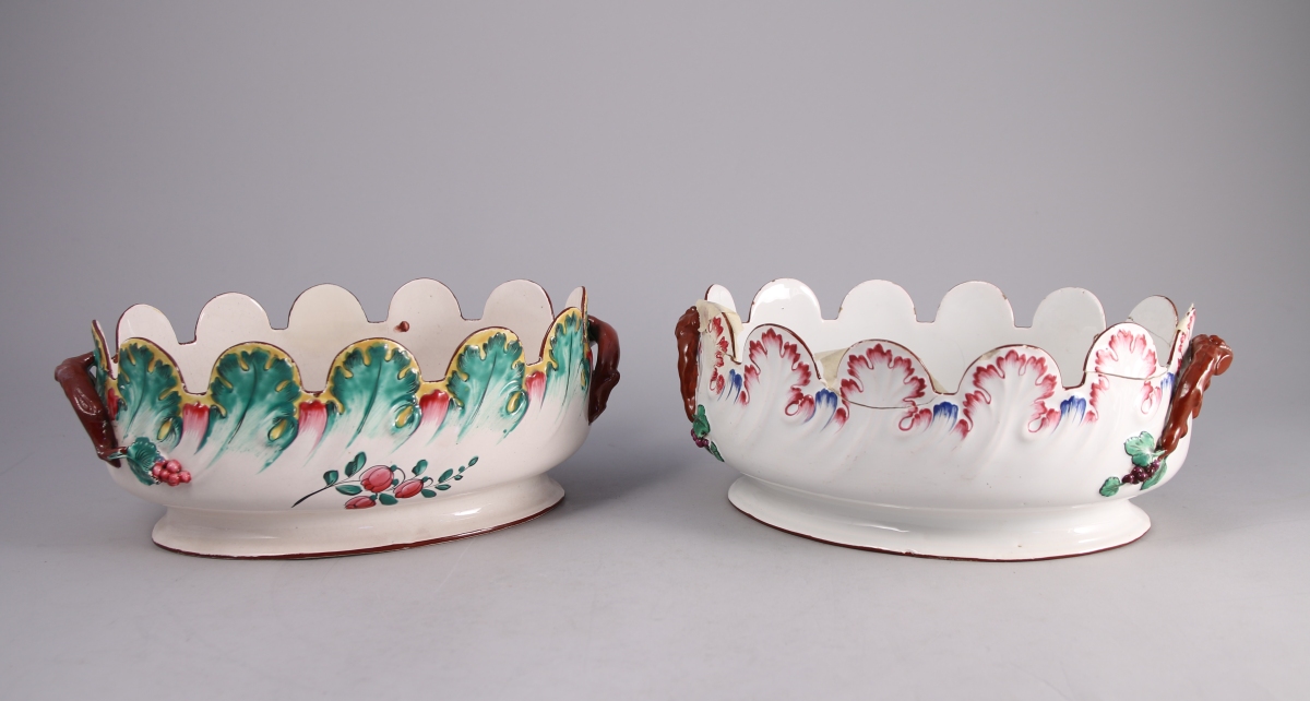 SAINT-CLÉMENT, faïence fine. DEUX VERRIÈRES crénelées de forme ovale. Décor polychrome, l'une de fleurs, l'autre rocaille.