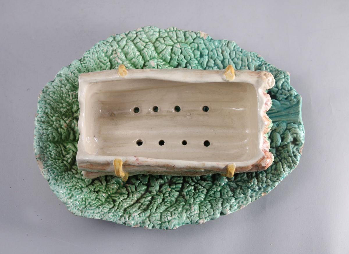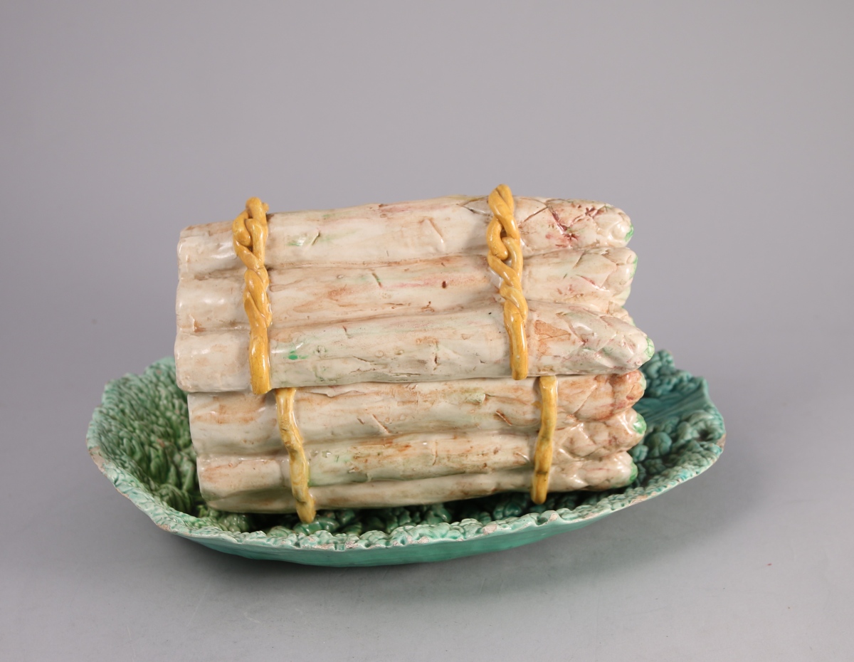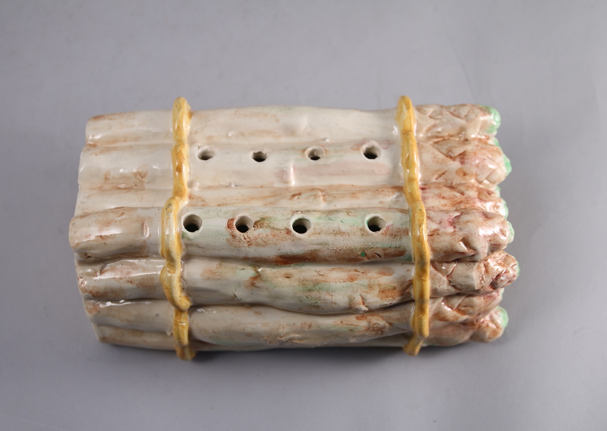 PRÉSENTOIR à décor polychrome "au naturel" en forme d'une botte d'asperges en faïence fine et son PLATEAU en feuille de choux.