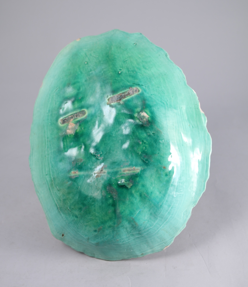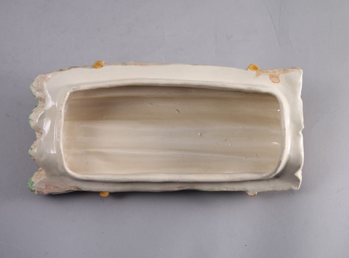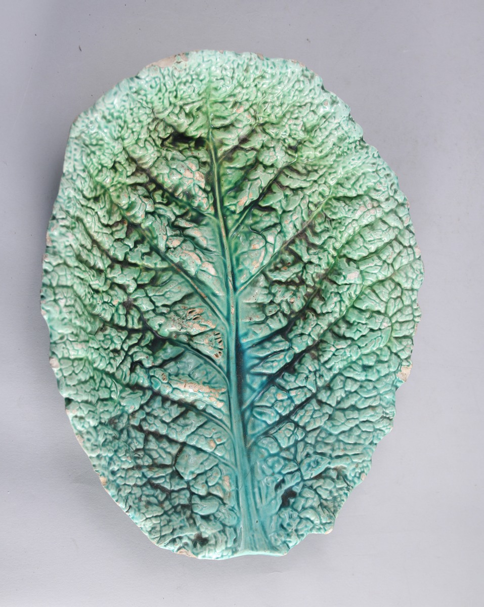 PRÉSENTOIR à décor polychrome "au naturel" en forme d'une botte d'asperges en faïence fine et son PLATEAU en feuille de choux.