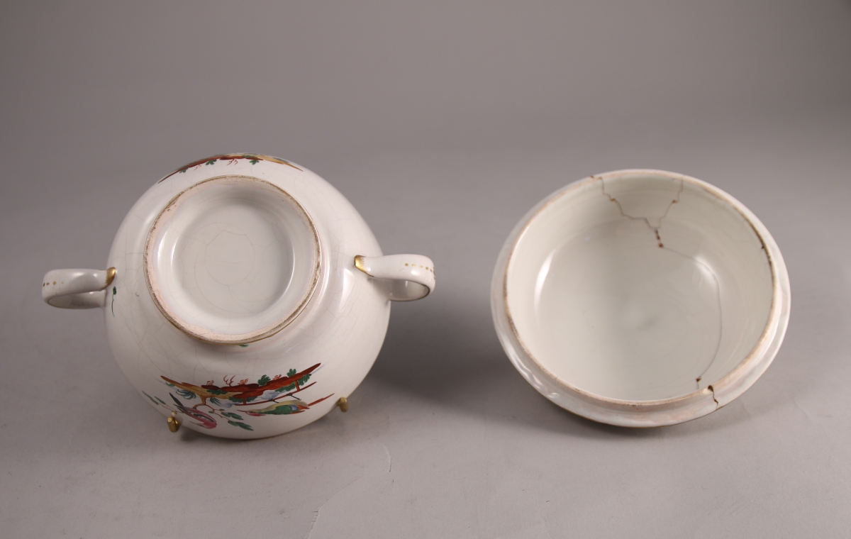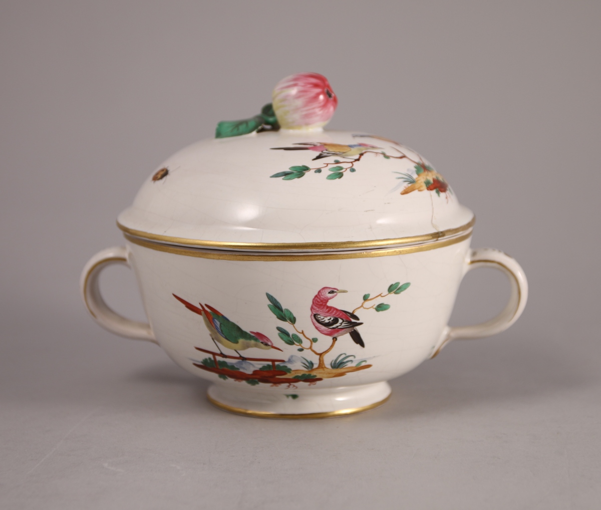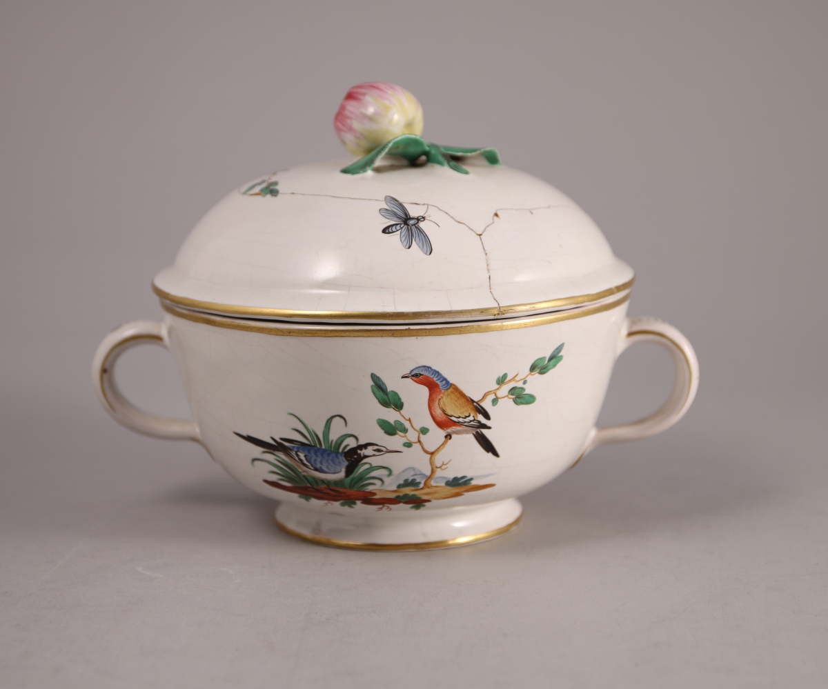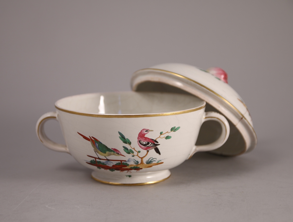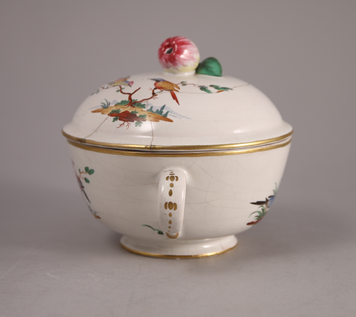 SAINT-CLÉMENT, faïence fine. ÉCUELLE couverte de forme ronde. Fin décor polychrome d'oiseaux branchés et insectes.