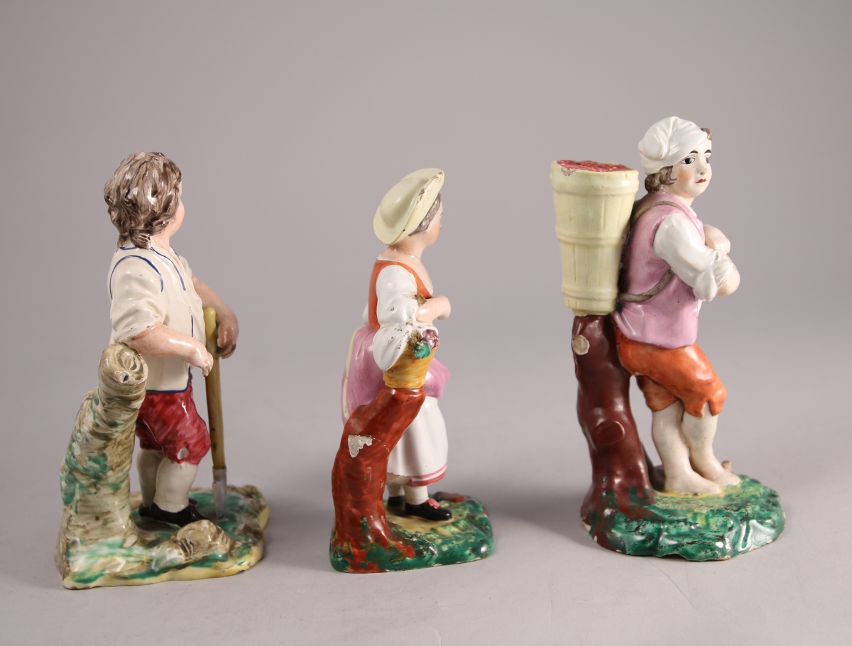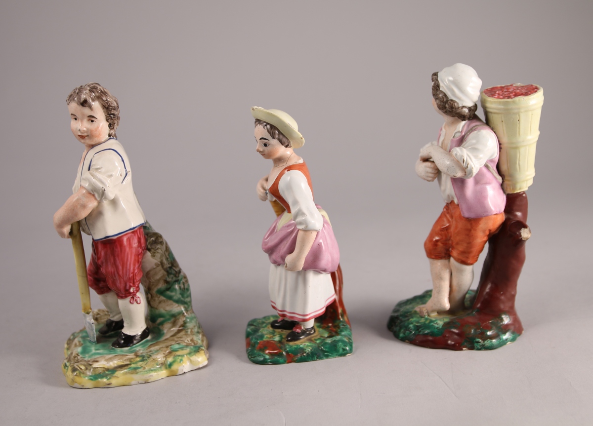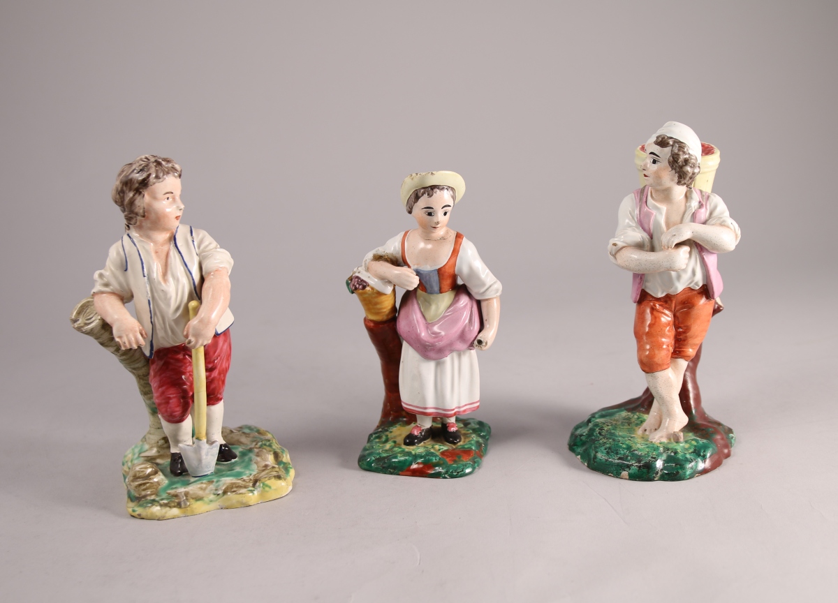 SAINT-CLÉMENT, faïence fine. TROIS STATUETTES polychromes figurant des paysans.