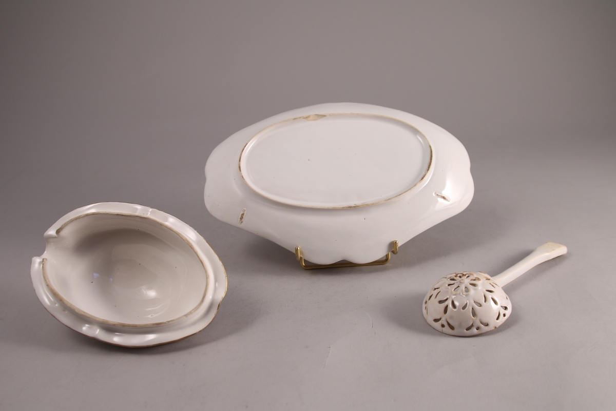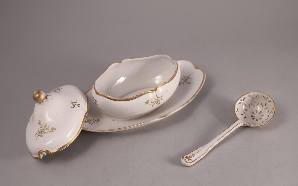 SAINT-CLÉMENT, faïence fine. SUCRIER couvert à plateau adhérent et sa CUILLÈRE à saupoudrer. Fond blanc à décor de barbeaux traités en dorure.