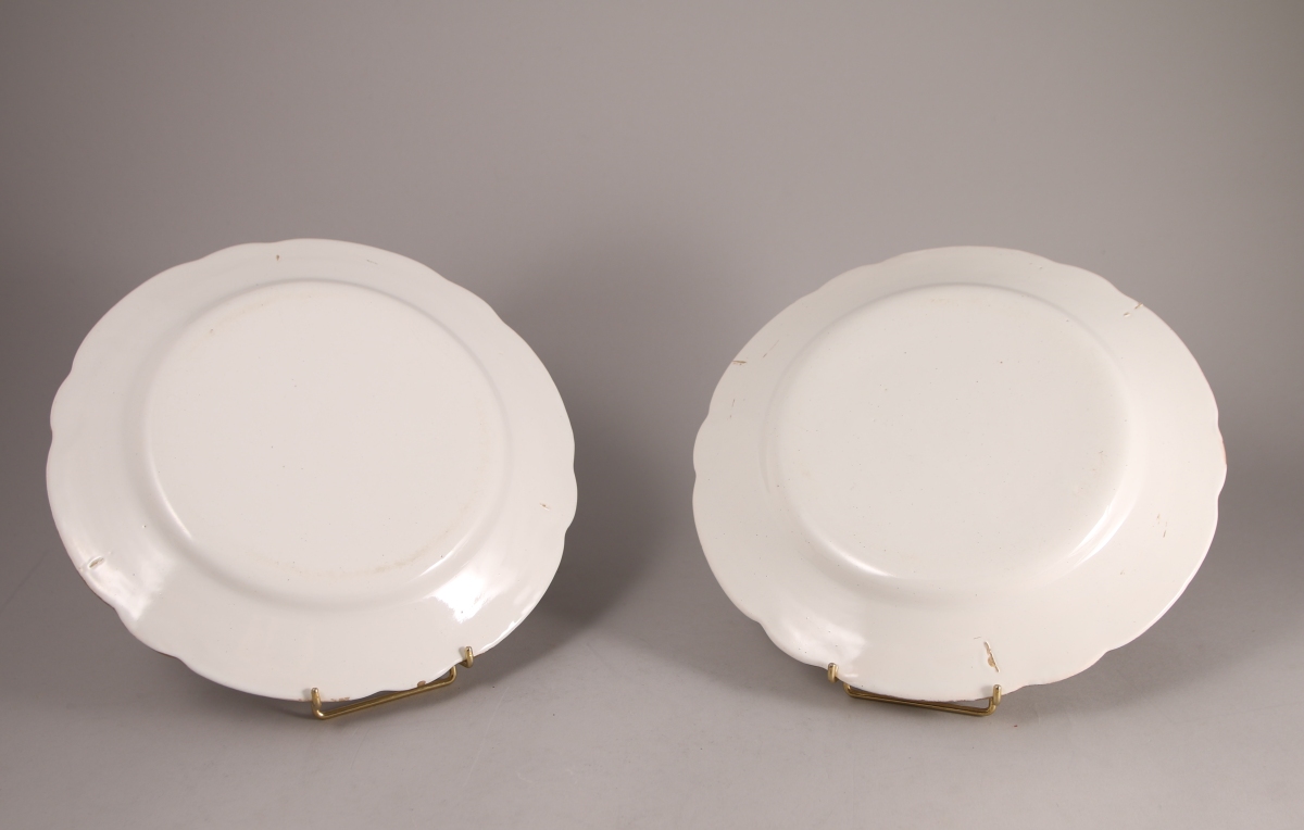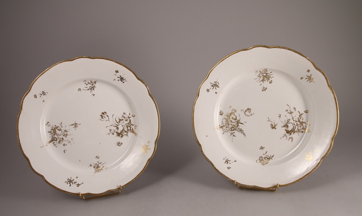 SAINT-CLÉMENT, faïence fine. Paire de PLATS de forme ronde à bords festonnés à fond blanc. Décor en plein de bouquets de fleurs traités en dorure.