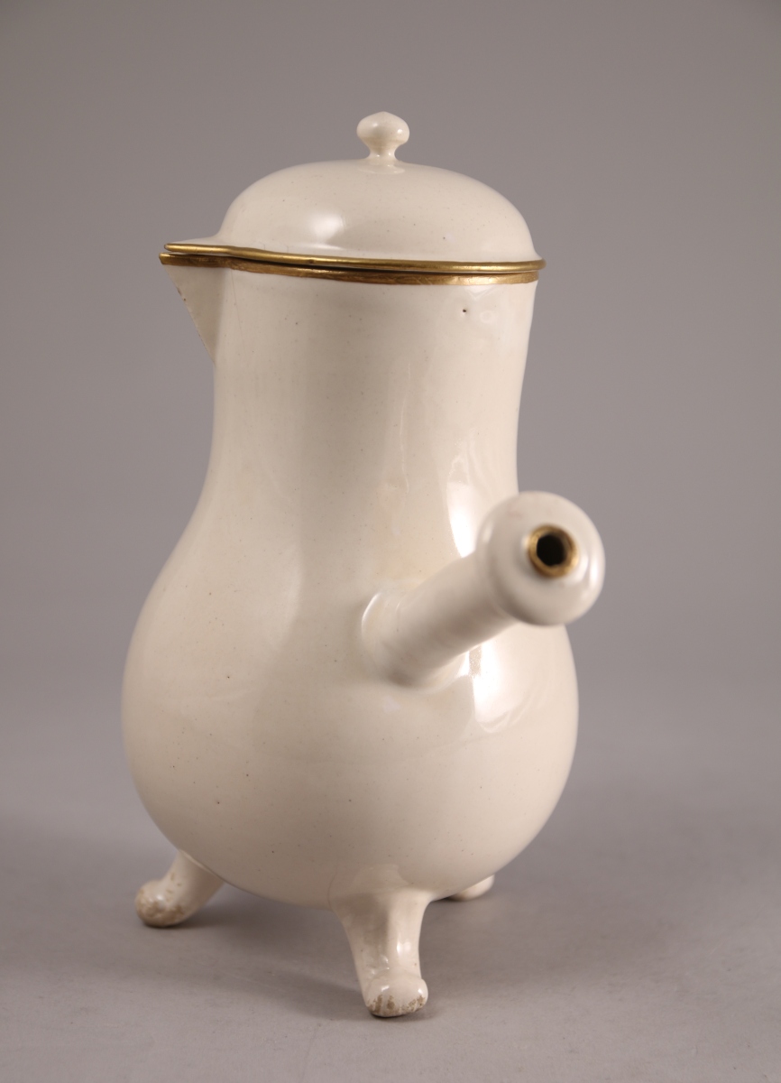 SAINT-CLÉMENT, faïence fine. CHOCOLATIÈRE couverte reposant sur trois pieds. Fond blanc à rehauts or.