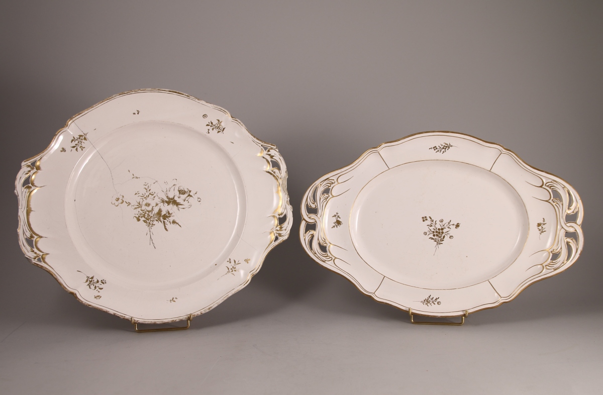 SAINT-CLÉMENT, faïence fine. DEUX PRÉSENTOIRS à décor de bouquets de fleurs traités à l'or sur fond blanc. Modèles orfèvrerie.