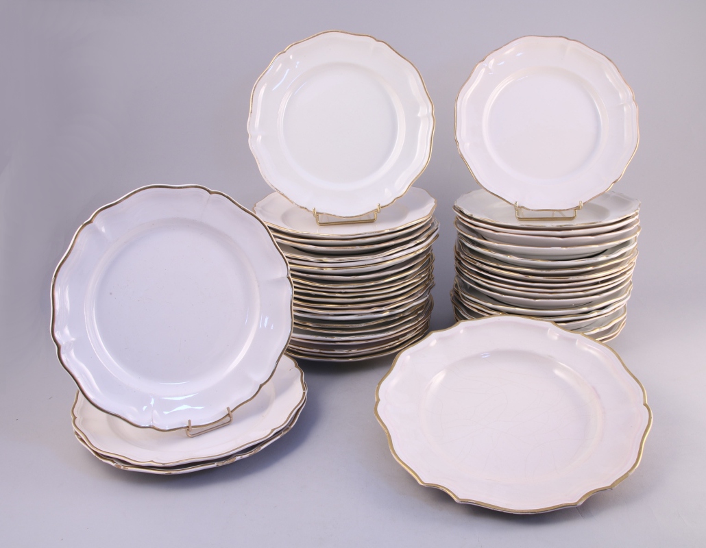 SAINT-CLÉMENT, faïence fine, 44 PIÈCES. 40 ASSIETTES et QUATRE PLATS de forme ronde à bords festonnés à fond blanc. Filet or en bordure.