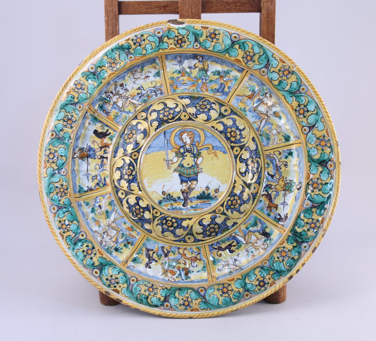 DERUTA ou PESARO? PLAT À OMBILIC en faïence polychrome figurant Saint-Michel. L'ombilic est cerclé de huit réserves à décor historié figurant Orphée, Artémis, Aphrodite et des scènes de chasse.