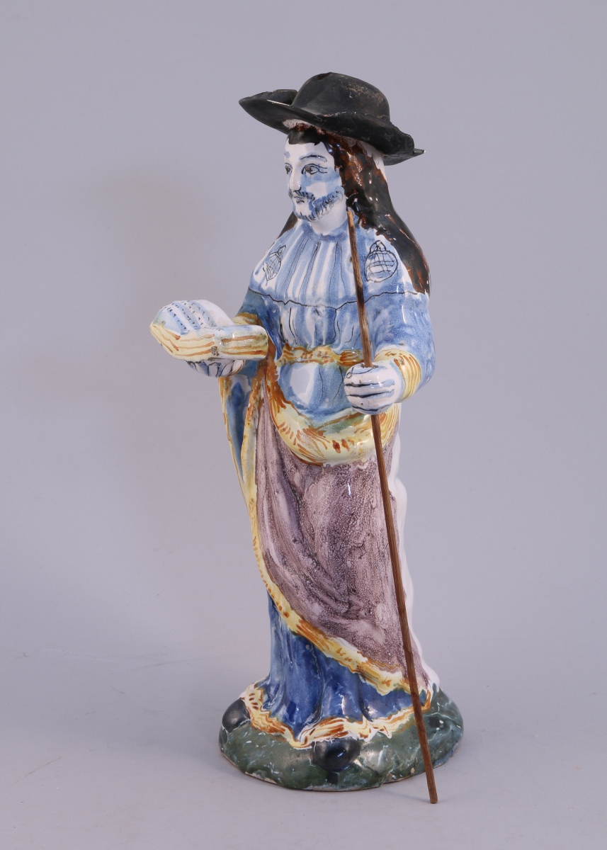 NEVERS. STATUETTE en faïence polychrome figurant SAINT JACQUES tenant un livre de la main droite.