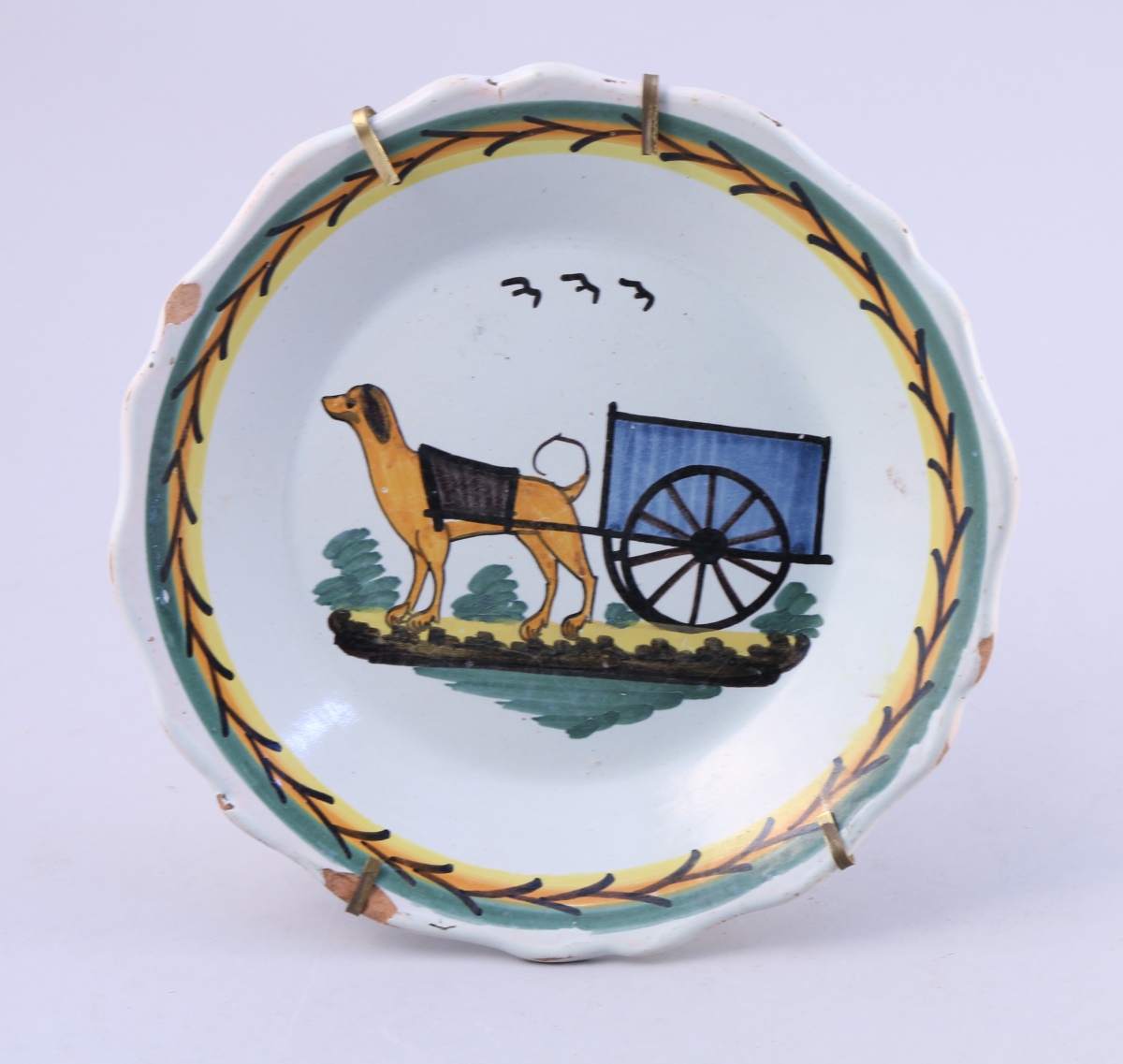 NIVERNAIS, faïence. ASSIETTE à décor polychrome représentant un chien tirant une carriole.