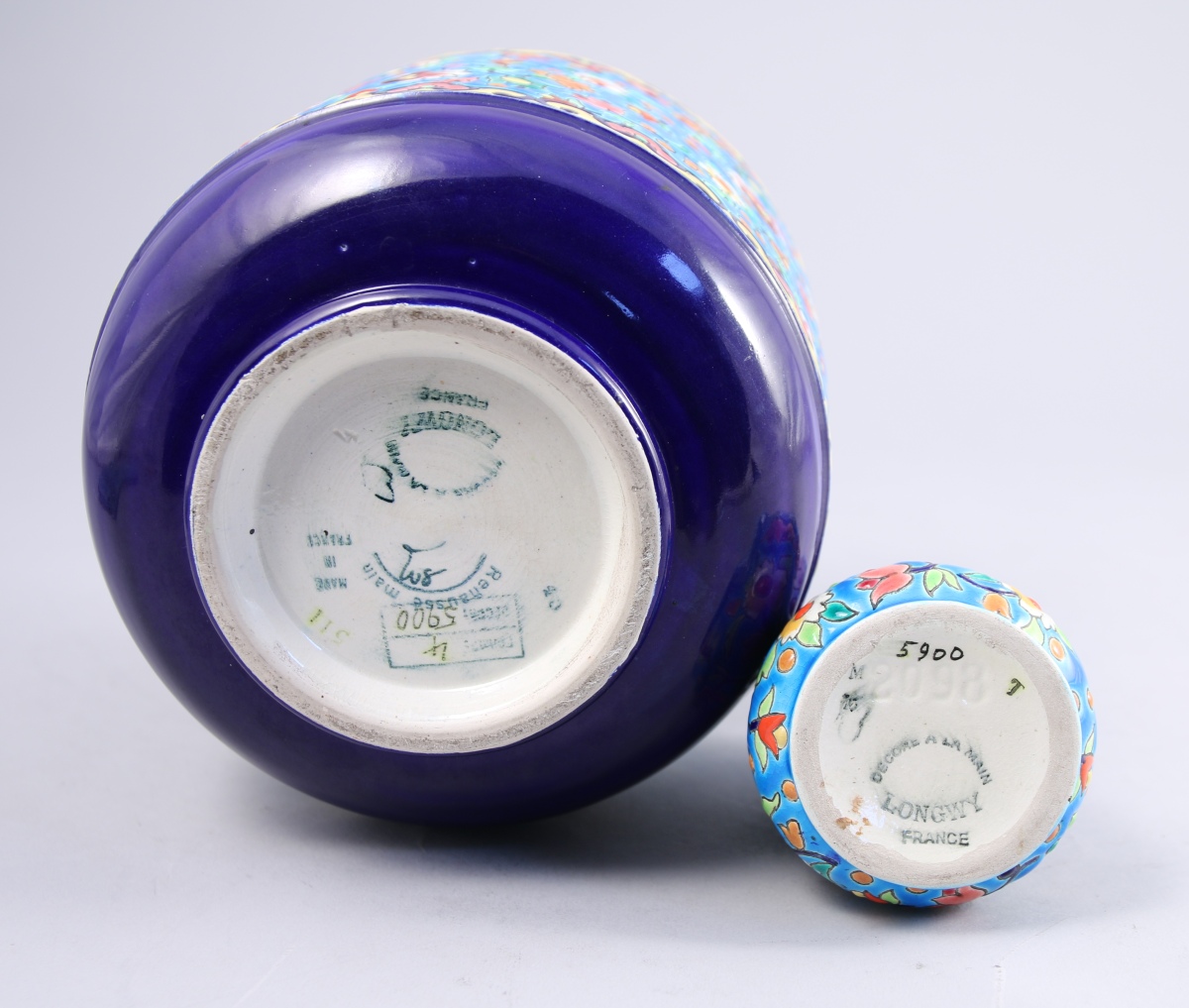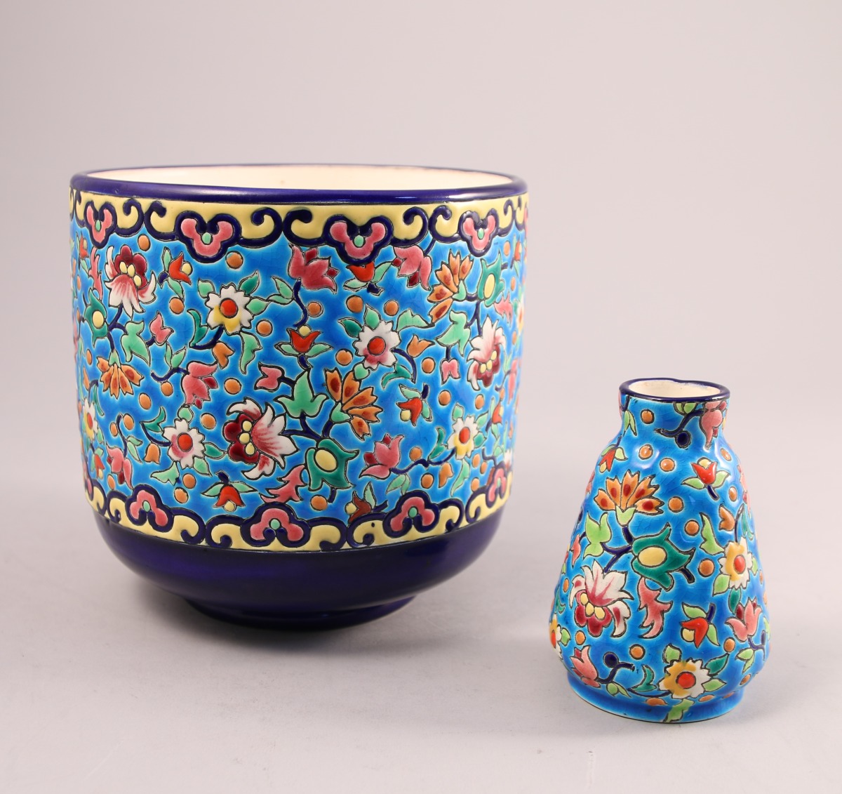 LONGWY. Cache pot et vase tubulaire. Décor floral à fond bleu turquoise.