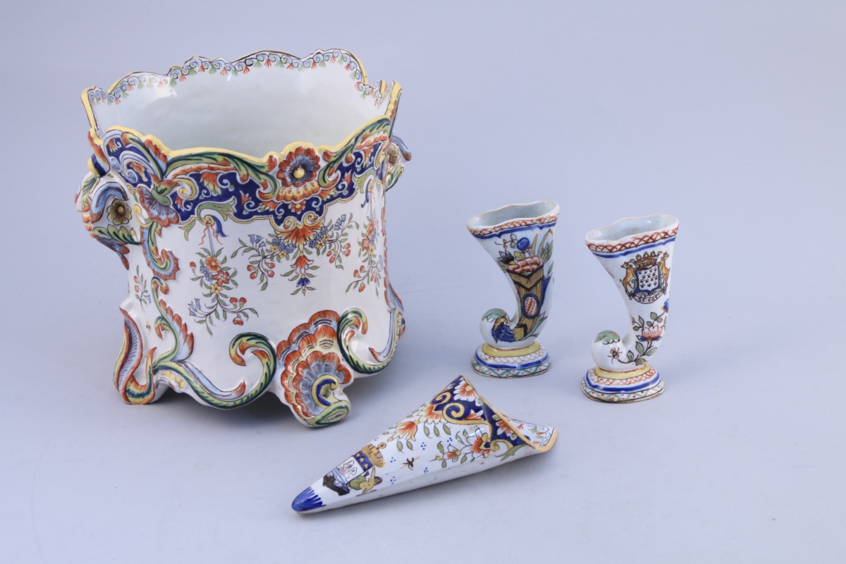 MALICORNE, genre de, QUATRE PIÈCES en faïence polychrome.