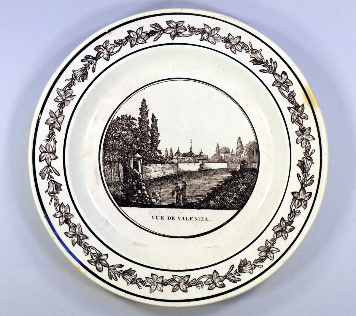 FRANCE. ASSIETTE en faïence fine à décor dans le bassin d'une vue de Valencia, animée de personnages. Aile de frise florale.
