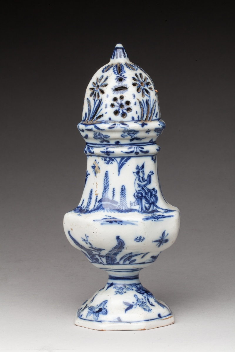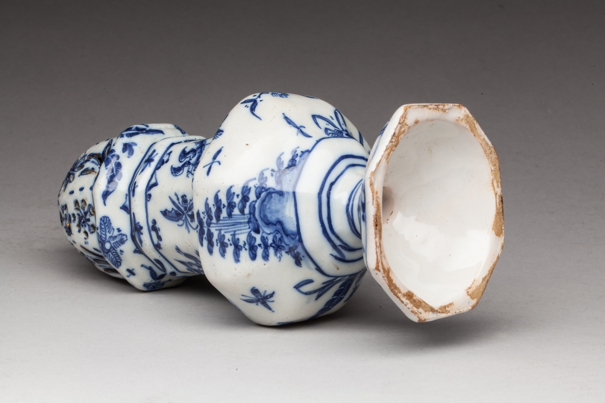 MOUSTIERS, NEVERS?, XVIIIe. SAUPOUDREUSE de forme balustre en faïence de camaïeu bleu, à décor à la Bérain sinisant.