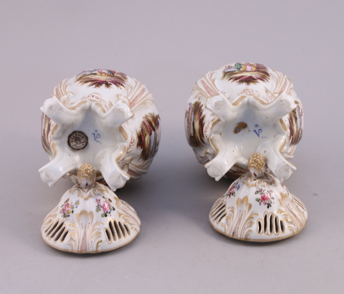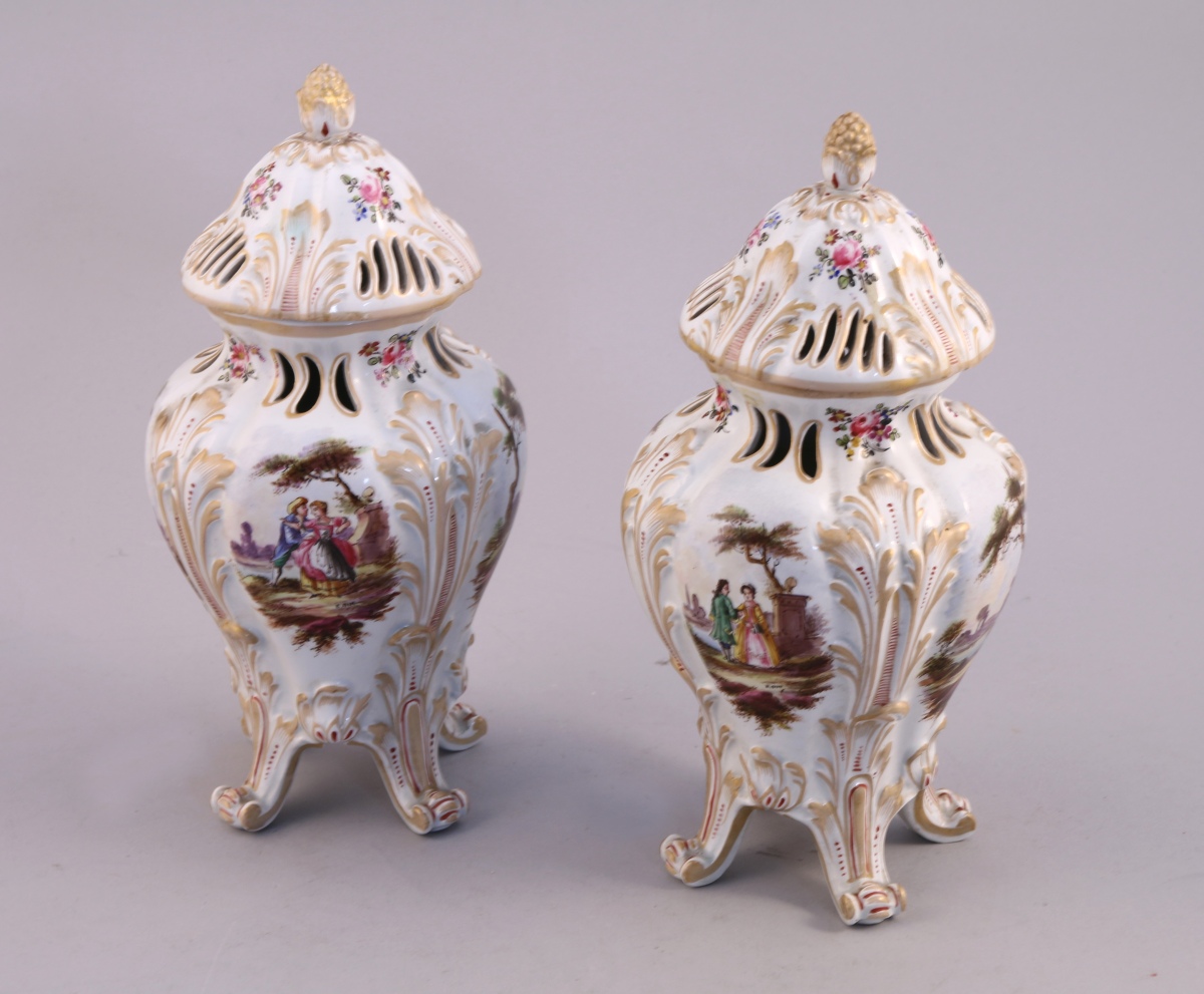 VEUVE PERRIN, faïence, dans le goût de. PAIRE DE POTS-POURRIS quadripodes à décor polychrome de couples dans des paysages romantiques et de bouquets fleuris.