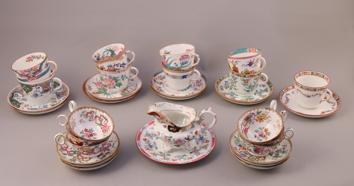 MINTON, deux suites de TASSES À THÉ et leurs sous-tasses, 14 PIÈCES, en porcelaine. Une suite de 8 et une suite 6 "Chinese tree" à décor polychrome d'inspiration sinisante. Marques.