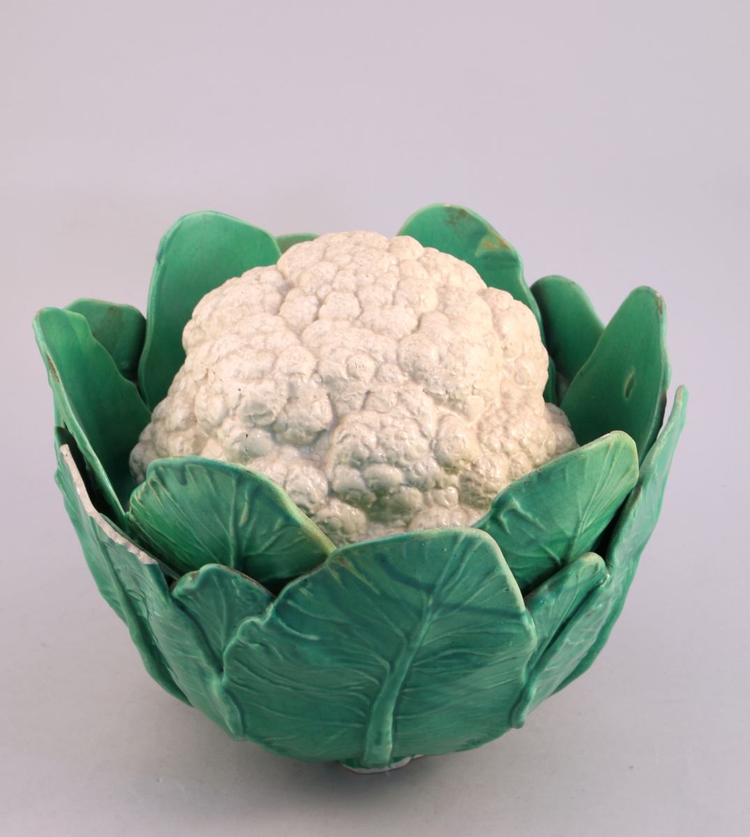 ANGLETERRE?, faïence fine. SOUPIÈRE à décor polychrome "au naturel" représentant un choux-fleur et ses feuilles