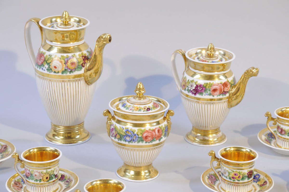PARIS. SERVICE À THÉ ET CAFÉ en porcelaine, douze pièces, à riche décor polychrome et or de fleurs au naturel . Il se compose d'une cafetière, d'une théière et d'un sucrier à corps ovoïde orné de filets reposant sur un piédouche. Le fretel en graine, le bec des verseuses en tête de lion, et l'anse à attaches palmette, à l'image des prises latérales du sucrier. Neuf tasses tronconiques légèrement évasées à anse à enroulements sommée d'une tête de lion. Elles sont accompagnées de leurs sous-tasses.
