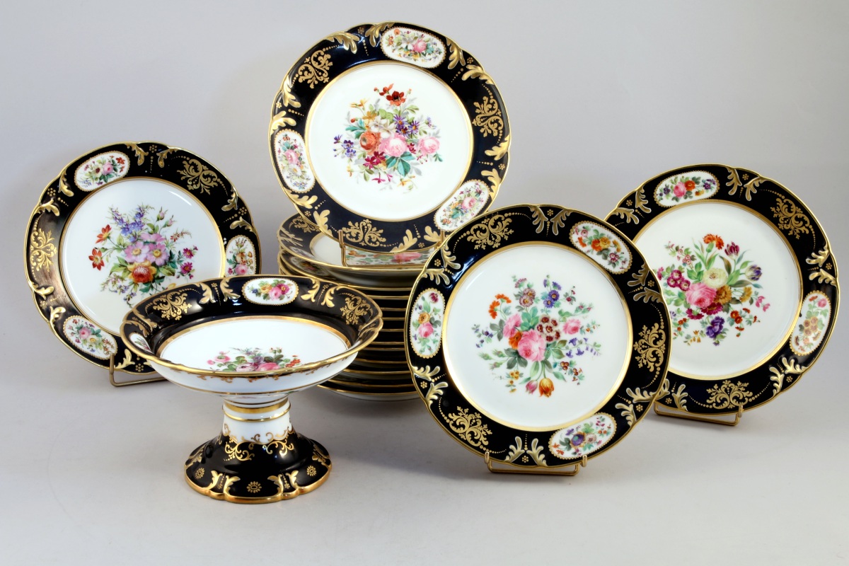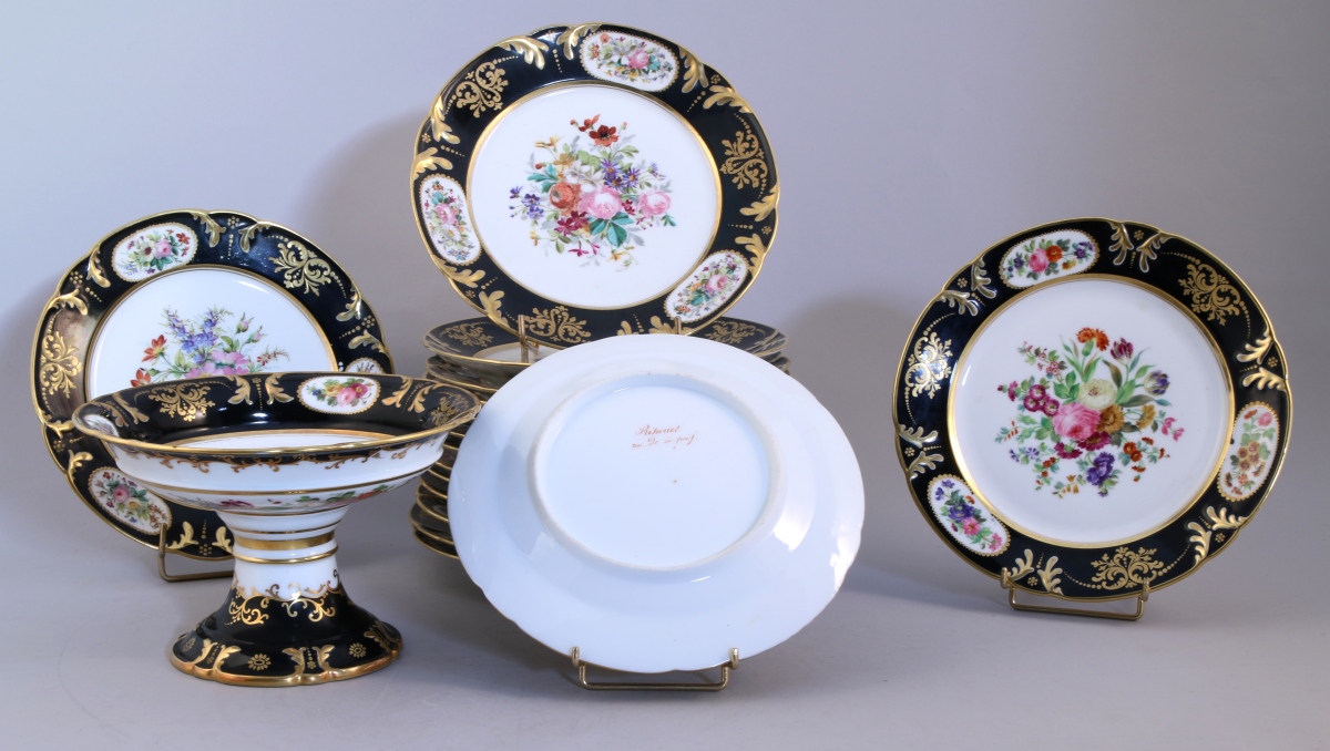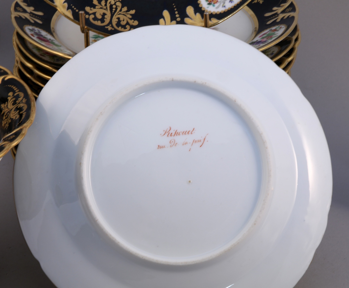 VIEUX PARIS. SERVICE à DESSERT, 17 PIÈCES, en porcelaine dite de Vieux Paris, à riche décor floral au naturel en son centre et aile à fond noir et or. Il se compose de 16 assiettes et d'une assiette montée. Marque en rouge brique: "RIHOUET rue de la Paix"