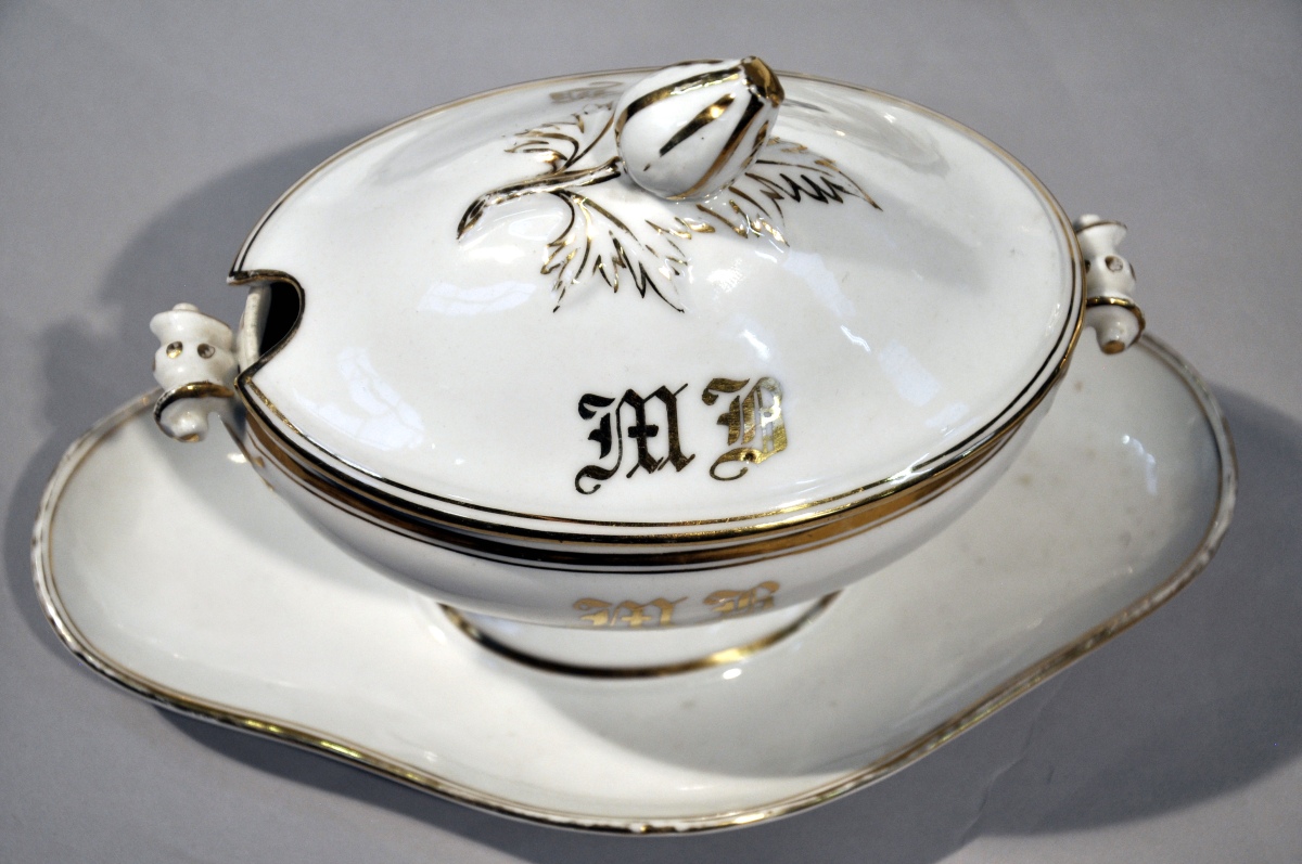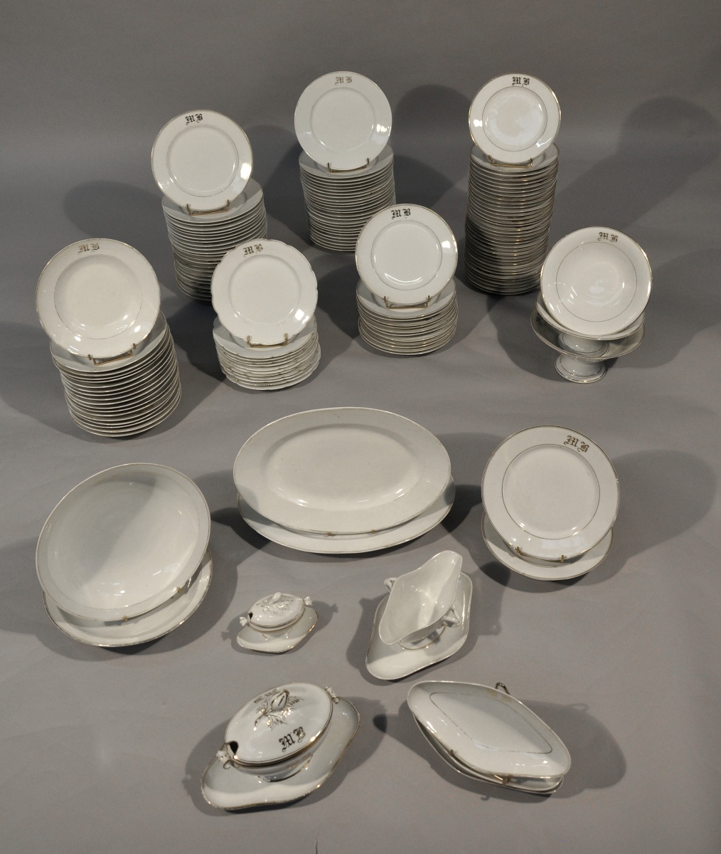 LIMOGES. SERVICE de TABLE en porcelaine, 141 pièces, orné de filets or et monogrammé "MB" en lettres d'or. Il se compose de 48 assiettes plates (diam. 23,5 cm.), 12 assiettes plates (diam. 22 cm.), 12 assiettes plates à bords chantournés (diam. 22 cm.), 18 assiettes creuses (diam. 23 cm.), 36 assiettes à dessert (diam. 20 cm.), 2 assiettes montées, 3 coupes sur pied, 2 plats creux de forme ronde, 2 plats de forme ovale, 3 raviers, une saucière couverte et son plateau adhérent, une saucière et son plateau adhérent et un moutardier et son plateau adhérent.