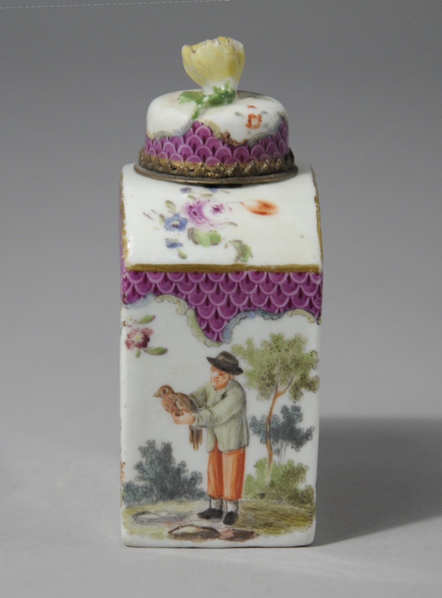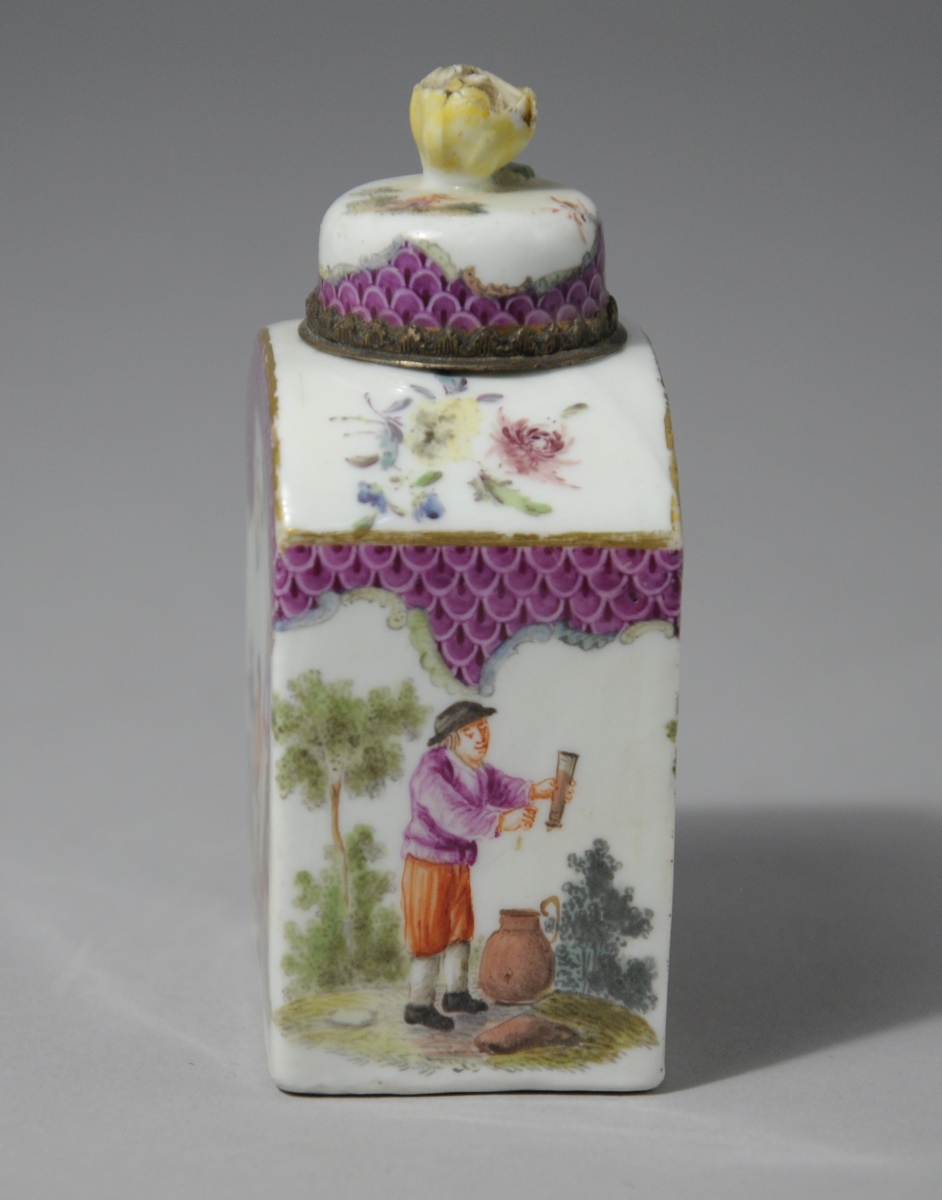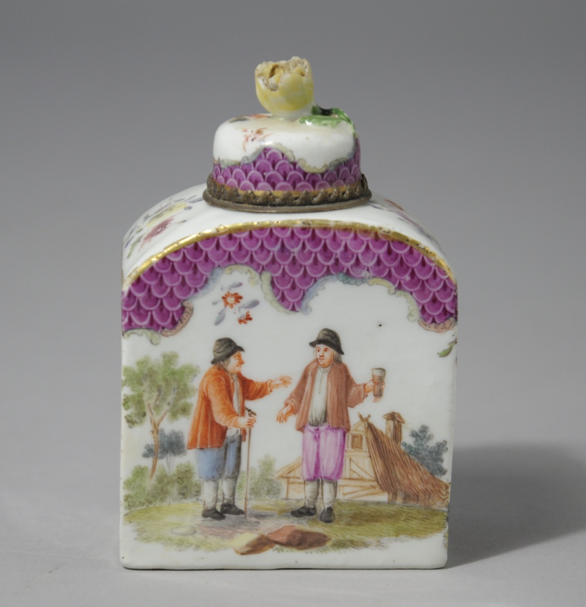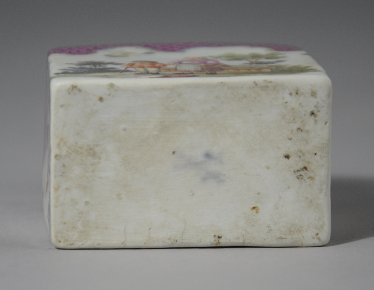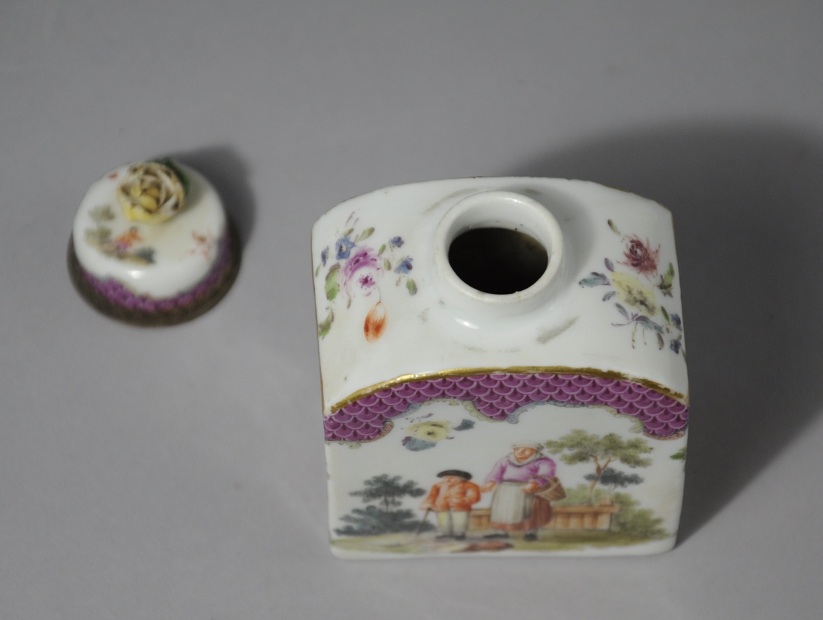 MEISSEN, porcelaine. FLACON À PARFUM de forme oblongue à décor animé de personnages ruraux sur fond paysagé. La partie supérieure des côtés et le bas du bouchon à motif d'écailles pourpres cernées de motifs rocaille et de filets or. Le fretel figurant une rose.