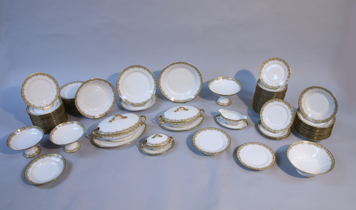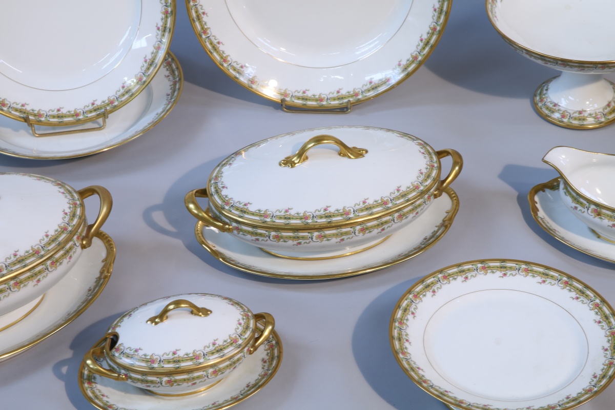 LIMOGES. SERVICE DE TABLE en porcelaine. 81 pièces à décor d'or mat et frise et entrelacs de semis de fleurs. Il se compose d'une soupière, d'un légumier, d'un pot à crème couvert à plateau adhérent, d'une saucière et son plateau adhérent, de 4 plats de forme ronde, de 2 plats de forme ovale, d'un saladier, de coupes sur piédouche, de 2 assiettes montées, de 30 assiettes, de 12 assiettes creuses et de 23 assiettes à dessert. Marque P.P.