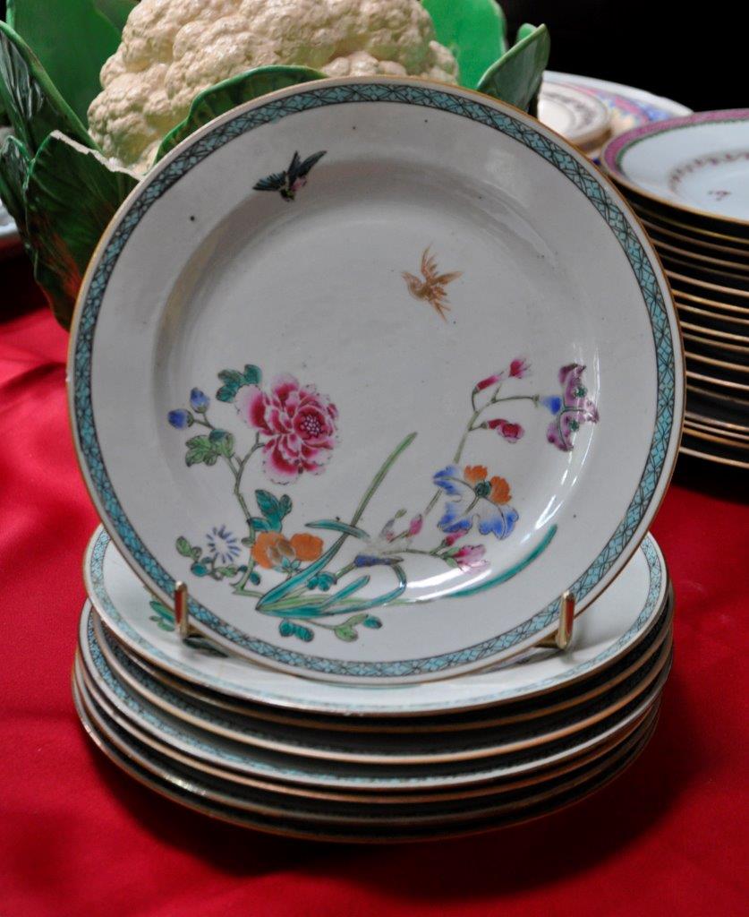 8 ASSIETTES en porcelaine à décor d'une frise fleurie verte sur le bord de ll'aile et de fleurs aquatiques, pivoines et d'oiseaux voletant au centre, en réserve blanche.