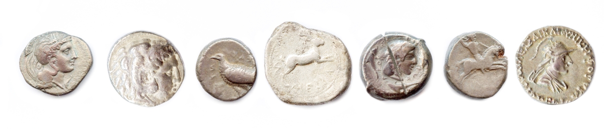 Lot de sept monnaies grecques en argent de Vélia, Agrigente, Messine, Syracuse, Alexandre le Grand, Perse Achéménide et Bactriane.