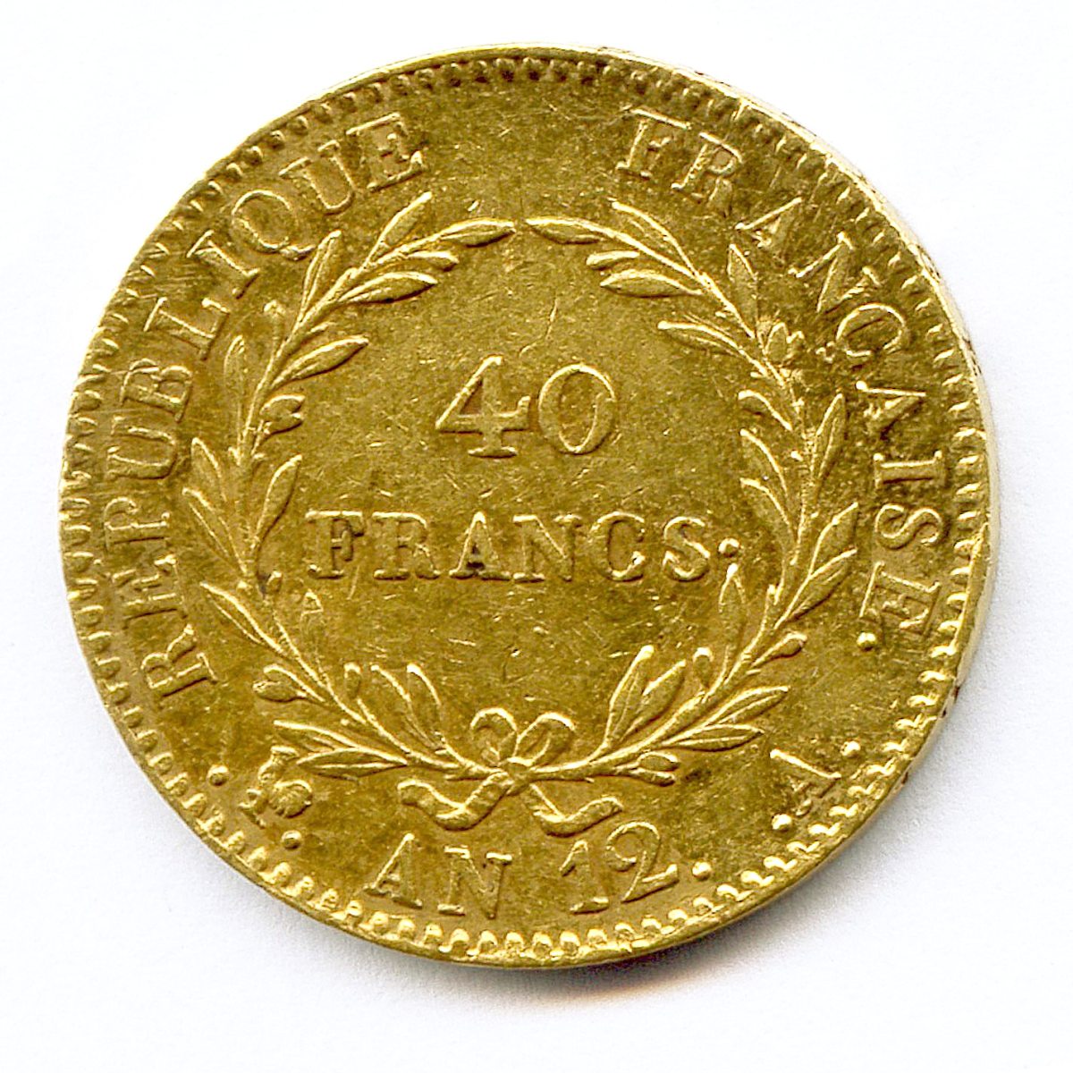 Bonaparte Premier Consul (1799-1804)40 Francs or (tête du Consul) an 12 Paris.(12,95 g) T.B.