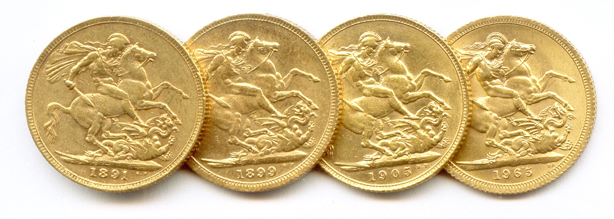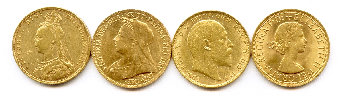 Lot de 4 souverains anglais en or (31,90 g): Victoria 1891 et 1899; Edouard VII 1905; Elisabeth 1965.