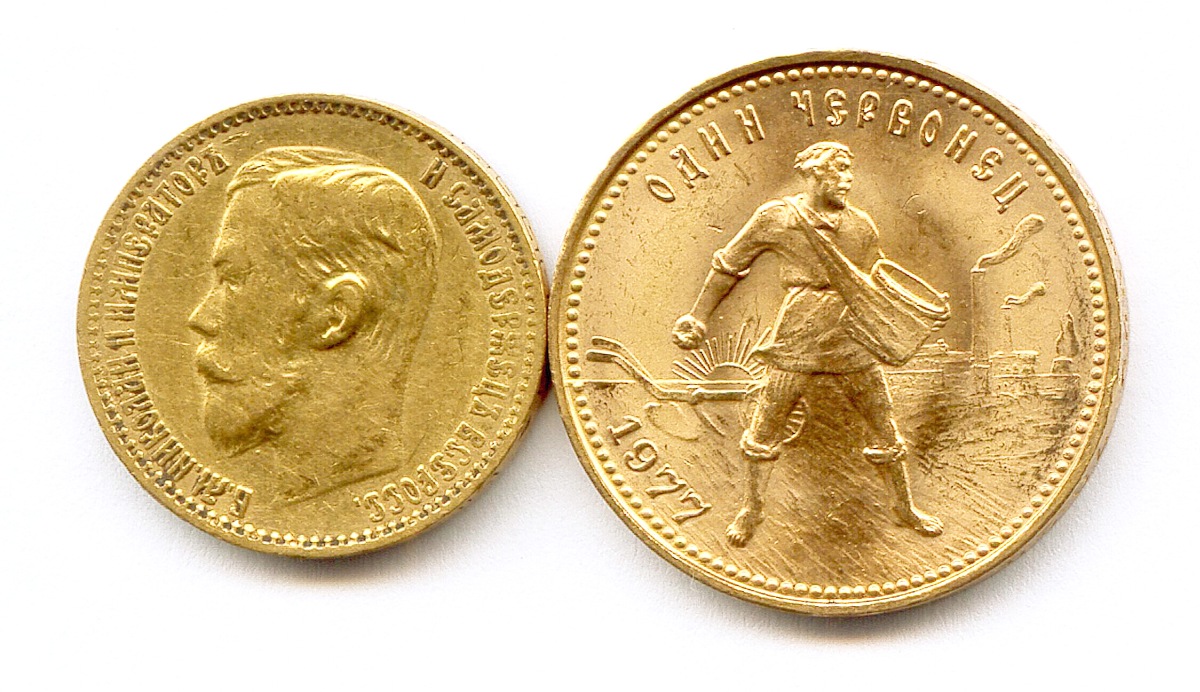 Lot de 2 monnaies russes en or (12,86 g): 5 roubles Nicolas II 1899 et Chervonetz (10 roubles) 1977.