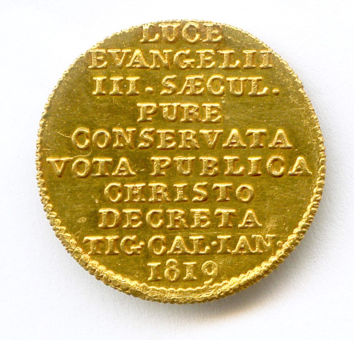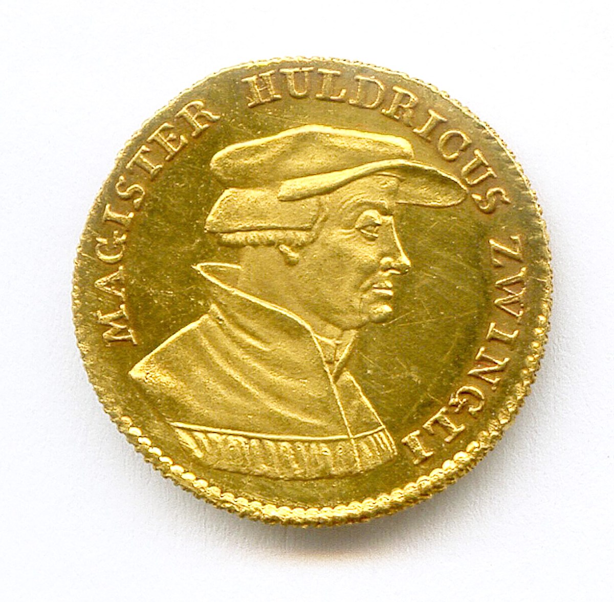 Ducat d'or à l'effigie de Huldrych Zwingli grand réformateur protestant, frappé en 1819 pour le 300e anniversaire de la Réformation.