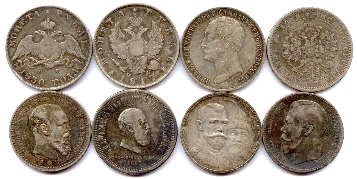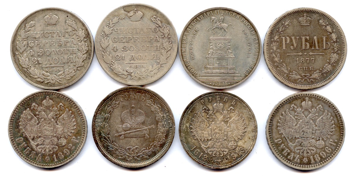 Rouble Alexandre Ier 1817, Rouble Nicolas Ier 1830, Rouble Alexandre II 1859 (monument de Nicolas Ier), Rouble Alexandre II 1877, Rouble Alexandre III 1883, Rouble Alexandre III 1892, Rouble Nicolas II 1896, Rouble des Romanof 1913. Beaux. T.B. et Très beau.